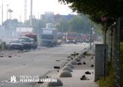 Die Explosionen schleuderten brennende Trümmerteile teils mehrere hundert Meter weit und lösten dadurch eine Reihe weiterer Brände aus. Industrieflächen in der Nähe sowie angrenzende Gebäude und Freiflächen wurden ebenfalls in Mitleidenschaft gezogen. Auch die nahegelegene Autobahn 1 musste mehrere Stunden lang vollständig gesperrt werden, da Trümmer auf die Fahrbahn fielen und ein Fahrzeug traf, wobei eine Person verletzt wurde. Die Feuerwehr errichtete einen Sicherheitsbereich von 400 Metern und entsandte Rettungseinheiten zur Versorgung der Verletzten auf die Autobahn.