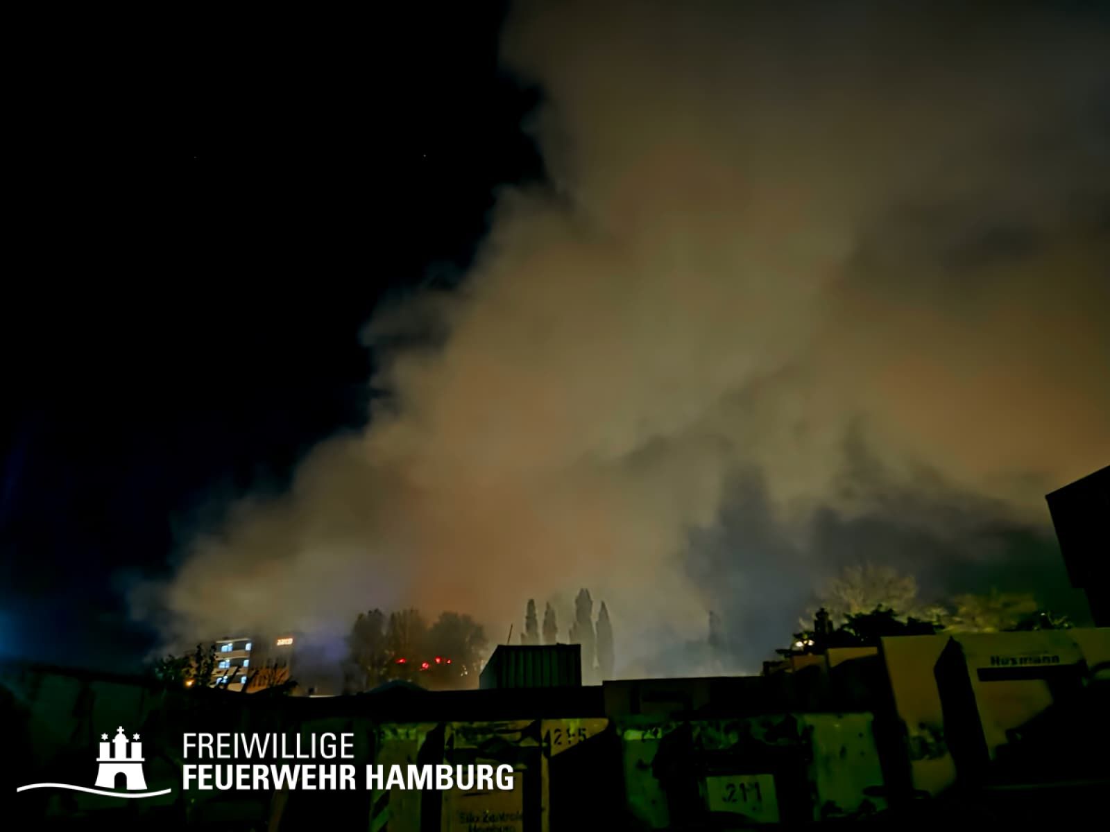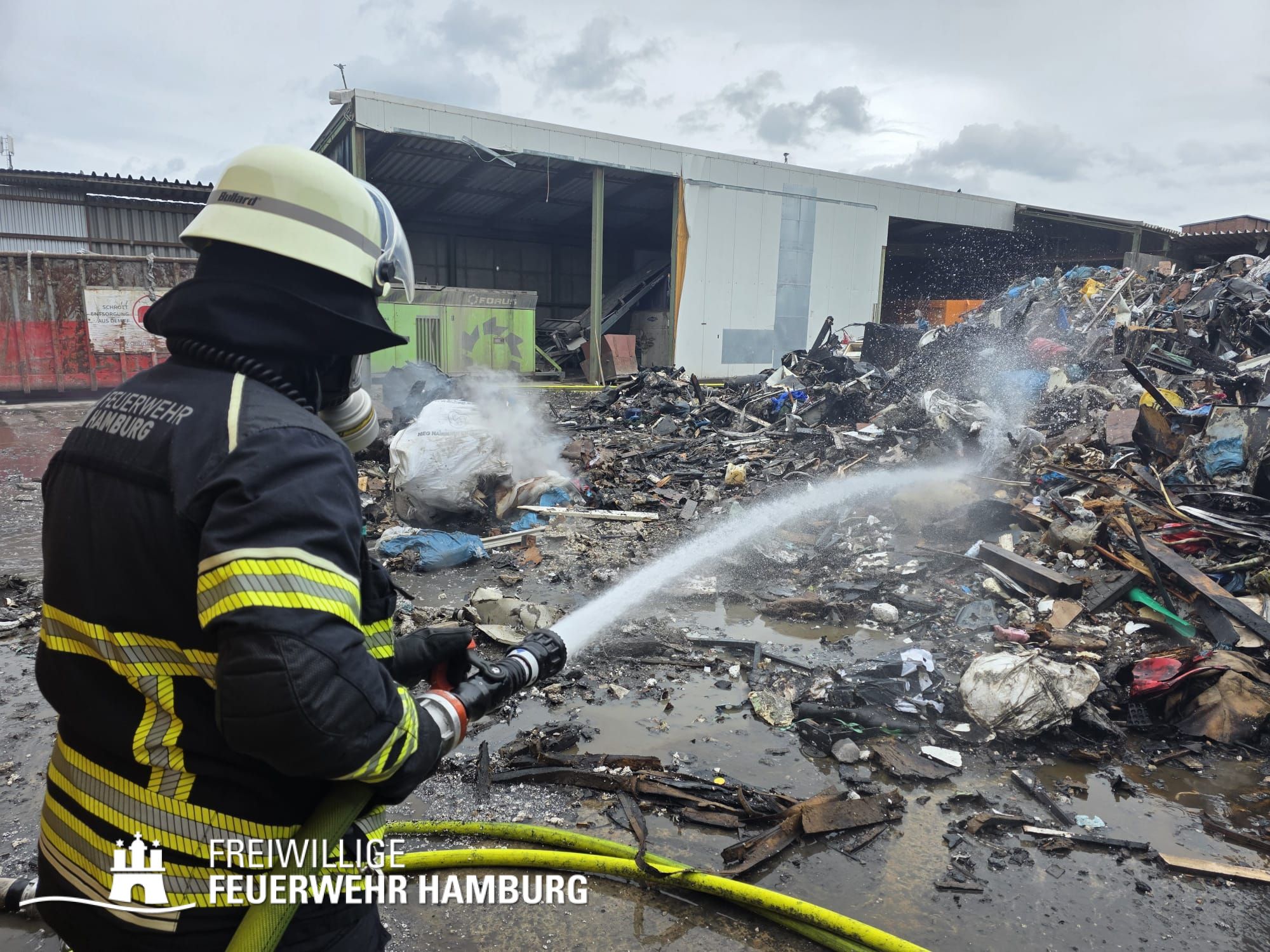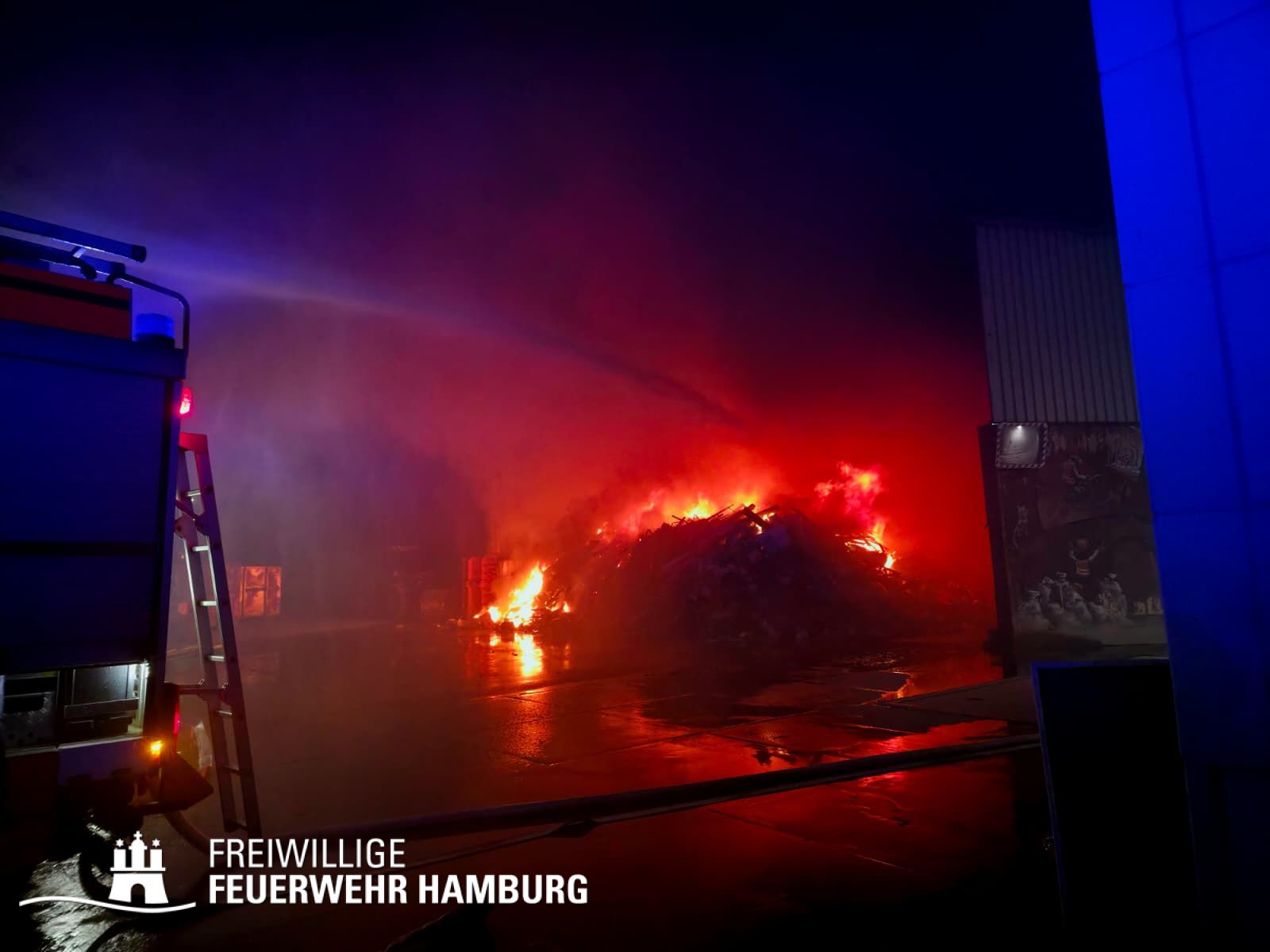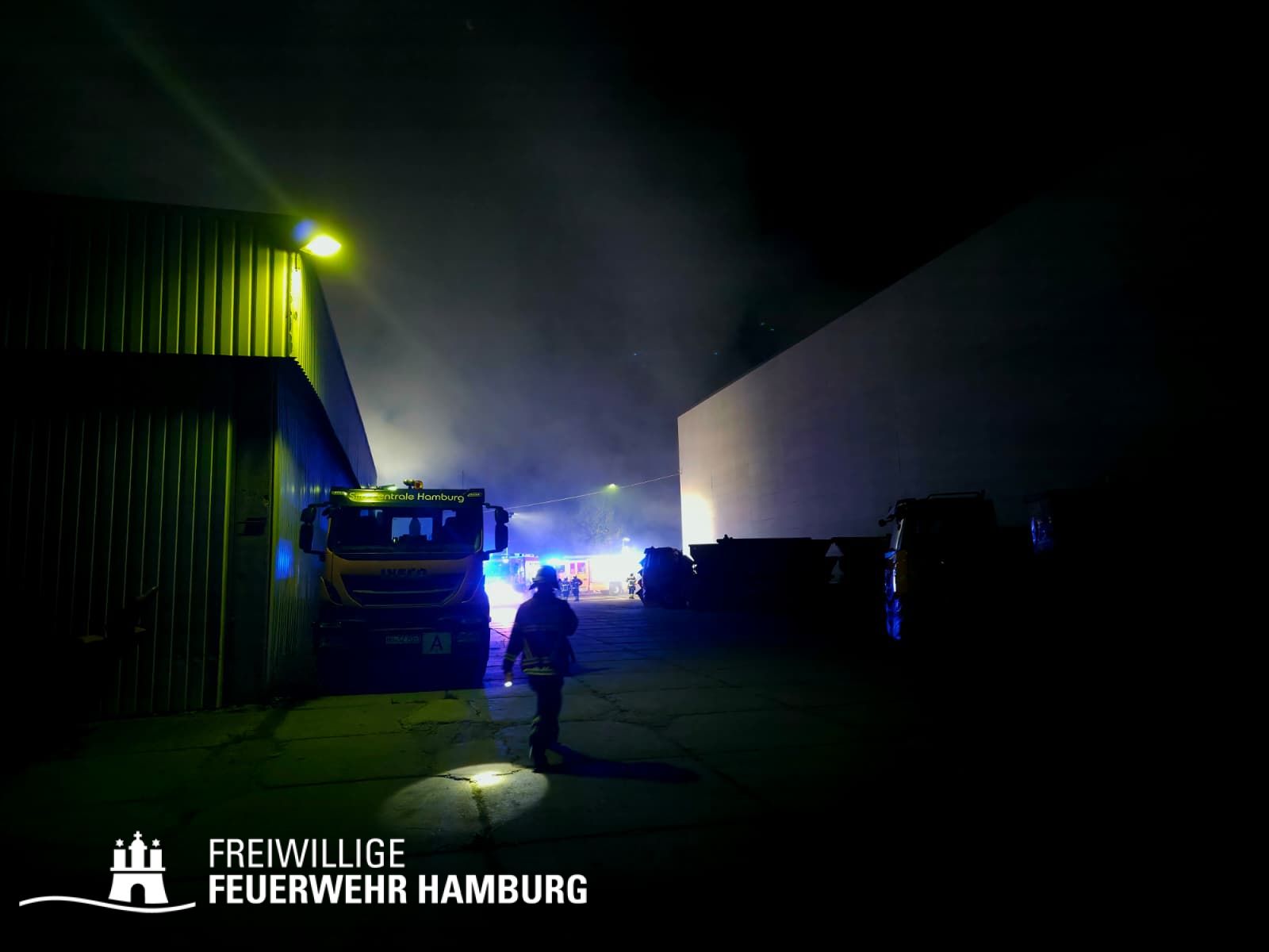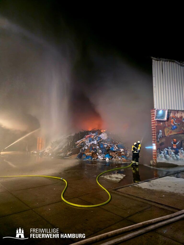 In der Nacht von Freitag auf Samstag wurde über den Notruf 112 der Rettungsleitstelle der Feuerwehr Hamburg ein Brand in einem Recyclingbetrieb gemeldet. Als die ersten Einsatzkräfte der zuständigen Feuer- und Rettungswache Stellingen eintrafen, brannten Bauschutt und Gewerbeabfälle unter einer Schleppdachhalle von ca. 30x20m bereits in voller Ausdehnung. Auch Teile der Halle waren vom Feuer betroffen.