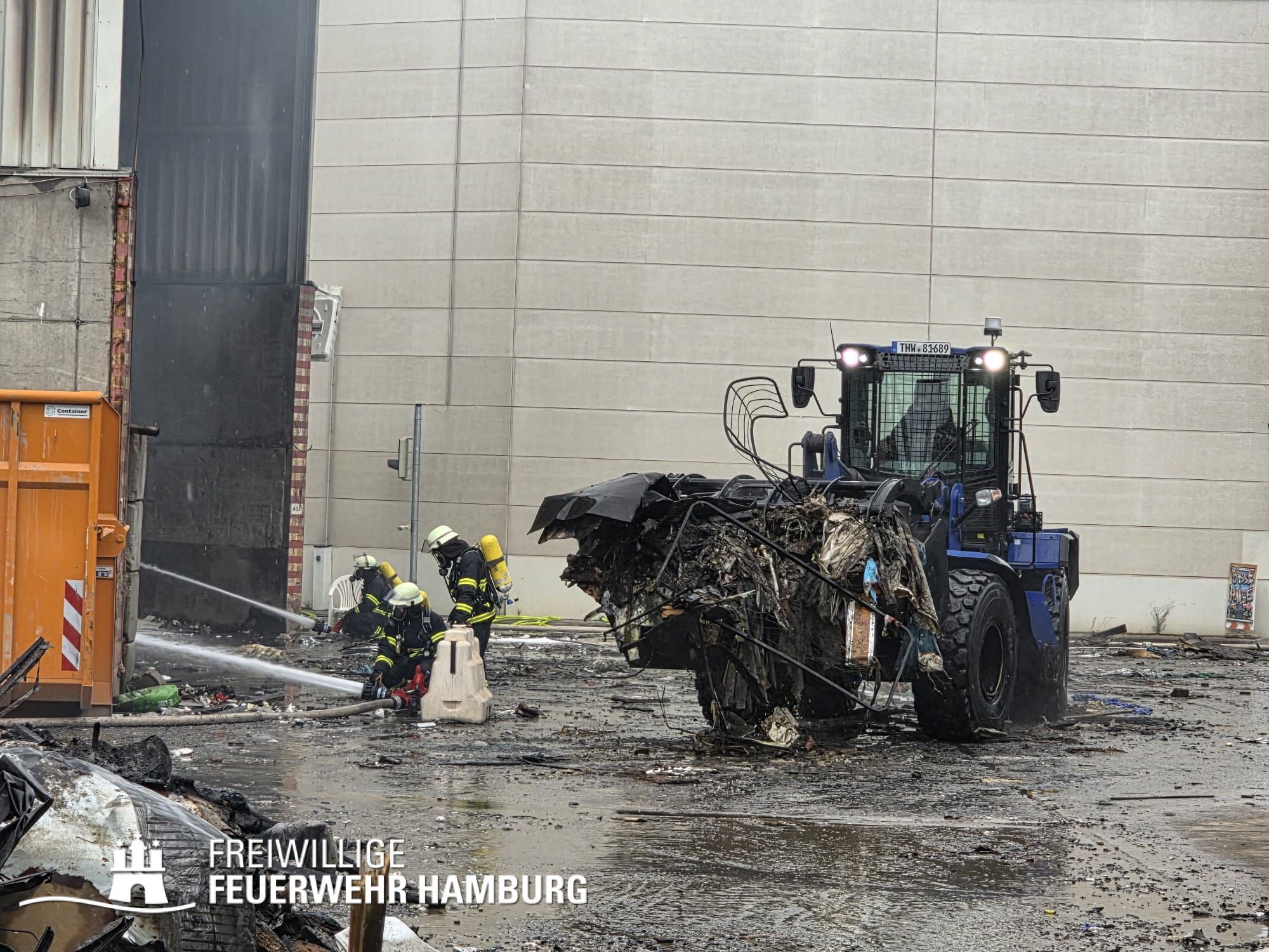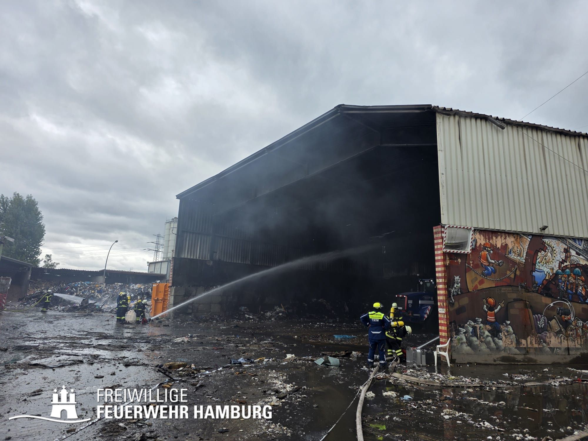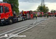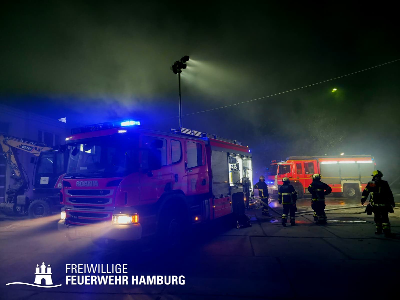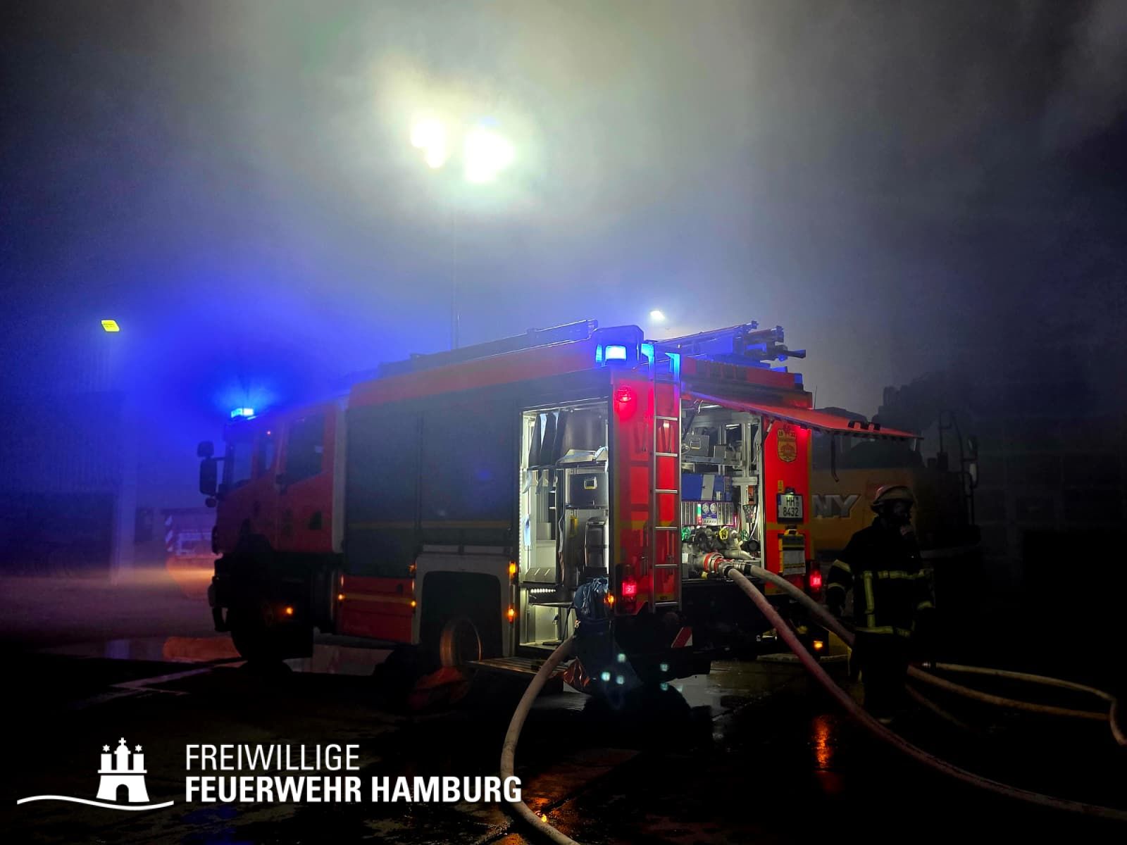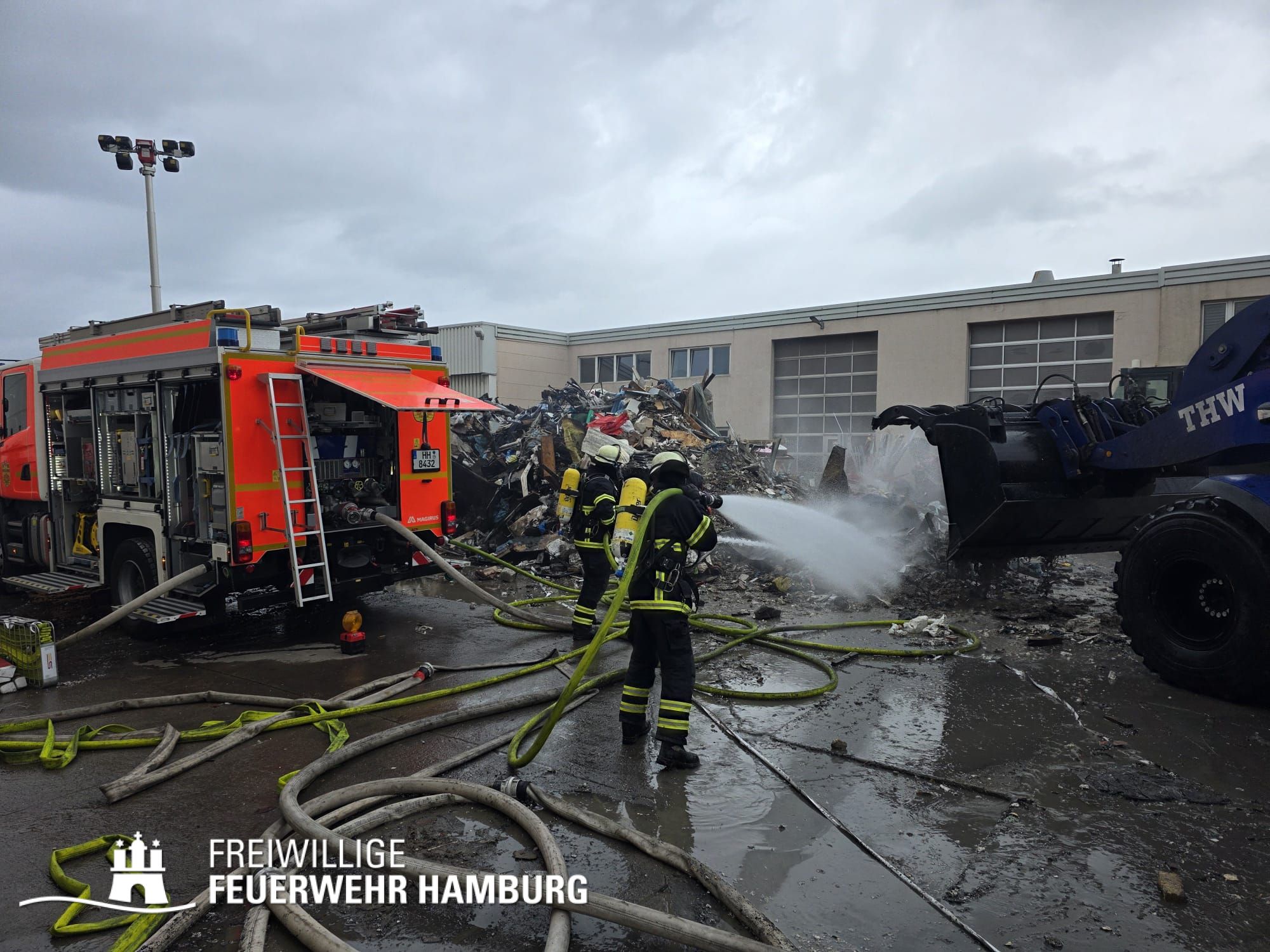 In der Nacht von Freitag auf Samstag wurde über den Notruf 112 der Rettungsleitstelle der Feuerwehr Hamburg ein Brand in einem Recyclingbetrieb gemeldet. Als die ersten Einsatzkräfte der zuständigen Feuer- und Rettungswache Stellingen eintrafen, brannten Bauschutt und Gewerbeabfälle unter einer Schleppdachhalle von ca. 30x20m bereits in voller Ausdehnung. Auch Teile der Halle waren vom Feuer betroffen.