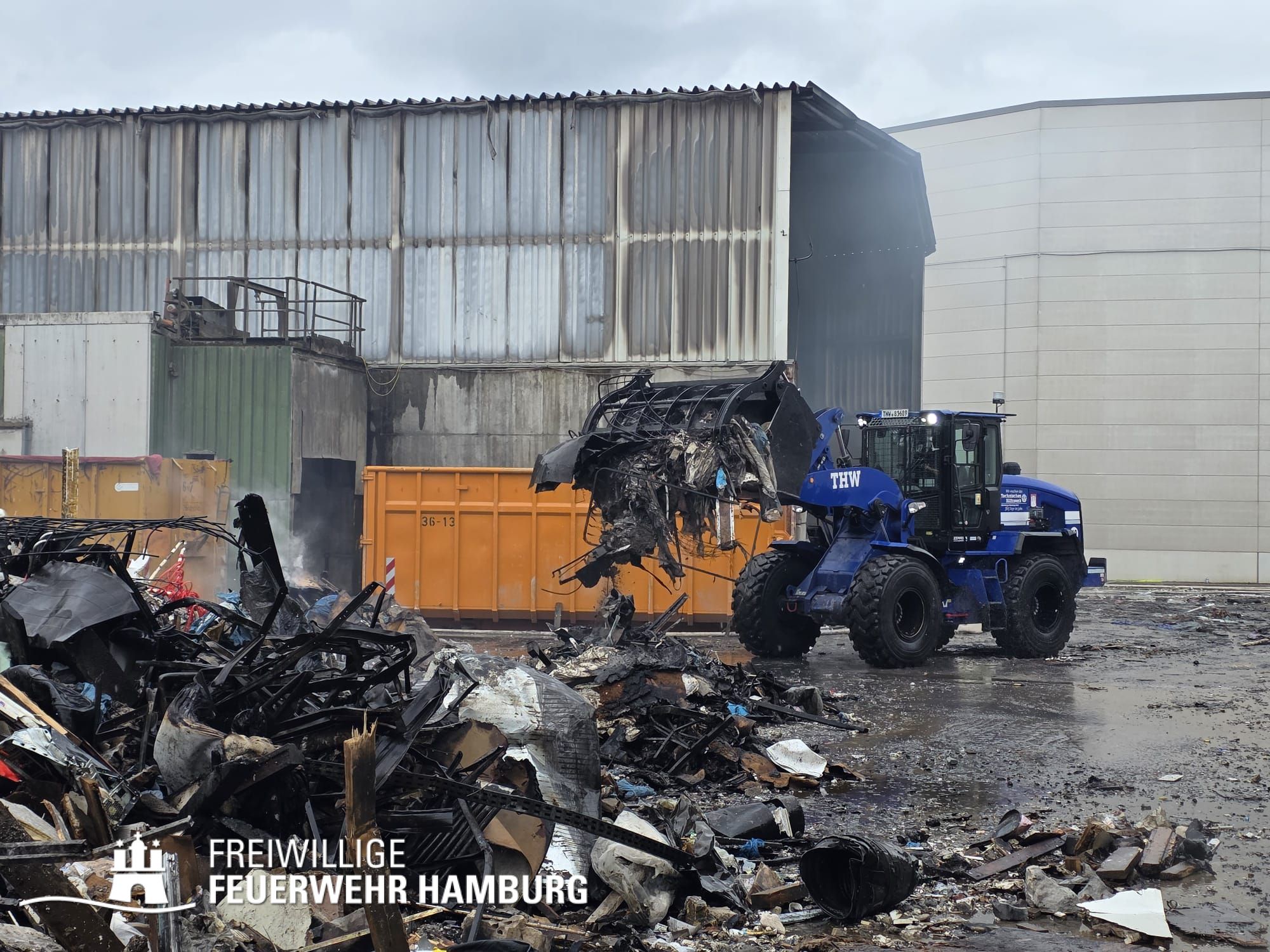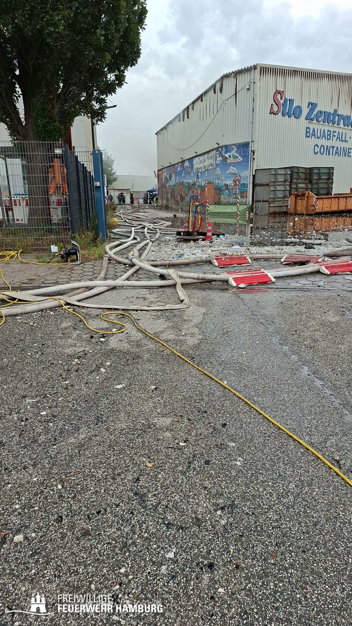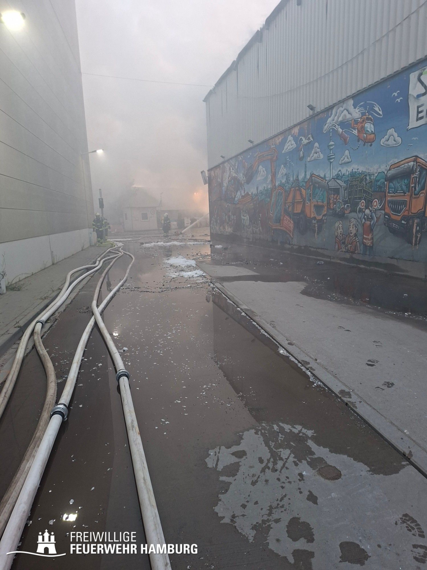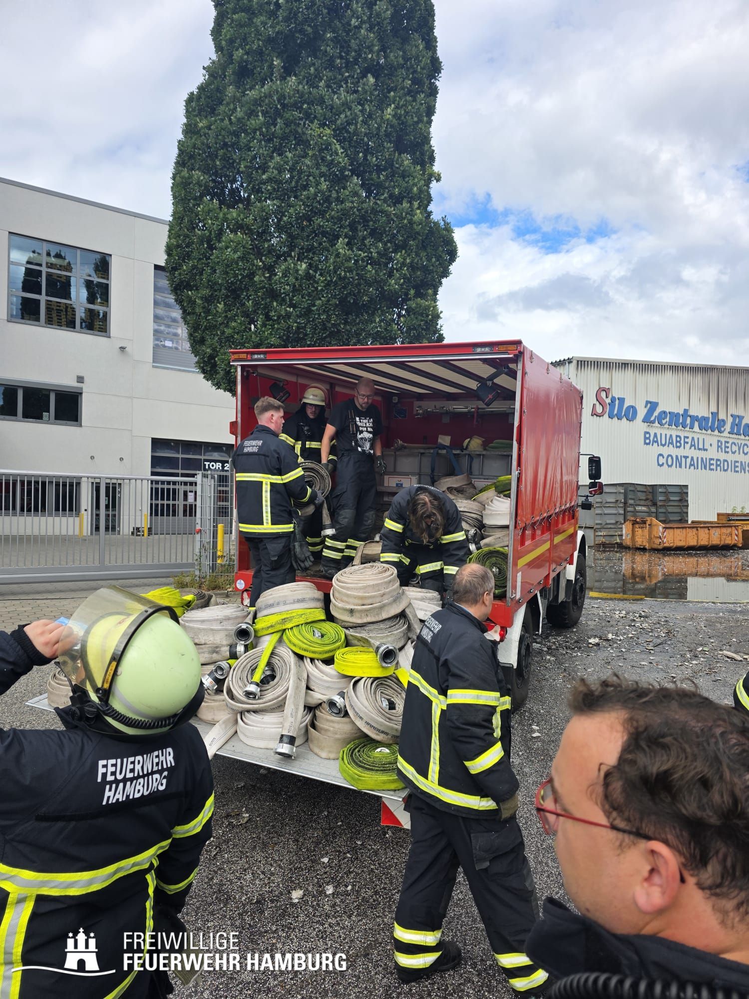 Beim Ablöschen des durch den vom THW aus der Halle beförderten Bauschutt wurden über den Tag die FF Eimsbüttel, Lurup, Osdorf, Berliner Tor, Bergstedt, Fuhlsbüttel und Bille eingesetzt. Für die Versorgung der Kräfte sorgte die FF Eissendorf, welche im späteren Verlauf durch die FF Lemsahl-Mellingstedt abgelöst wurde. Die FF Sinstorf war mit ihrem neuen CBRN-Erkunder zu Messfahrten in der Umgebung im Einsatz.