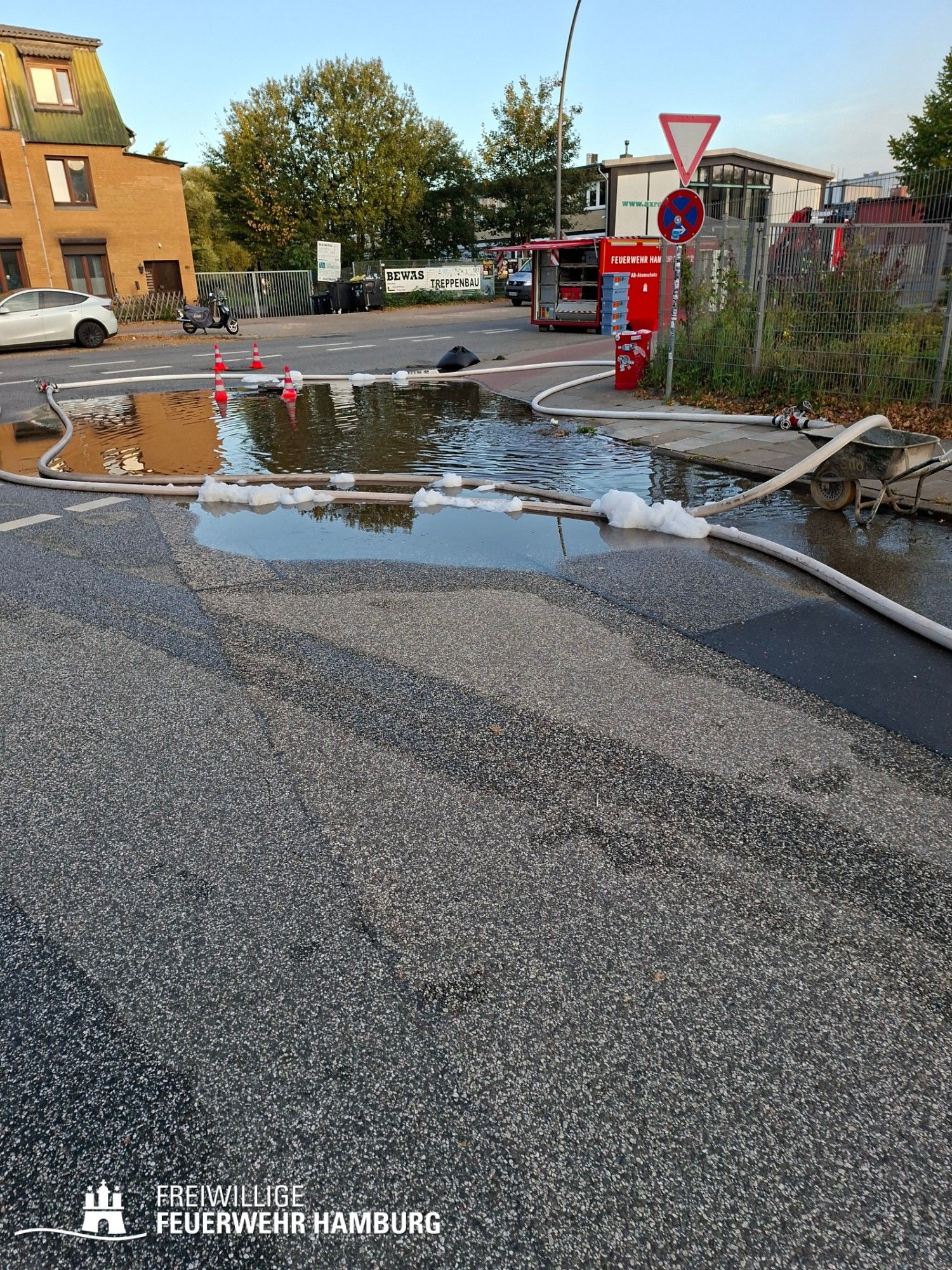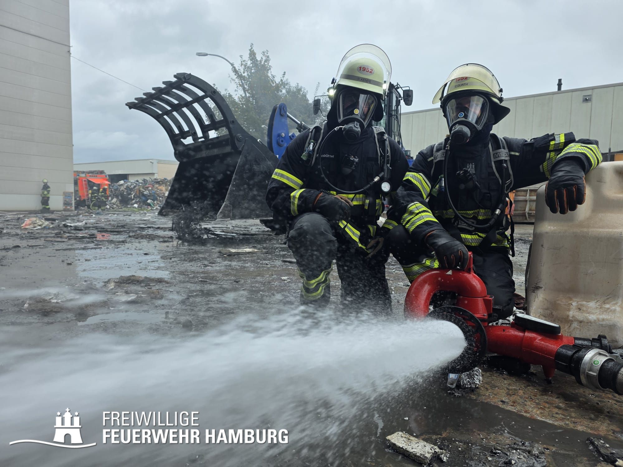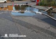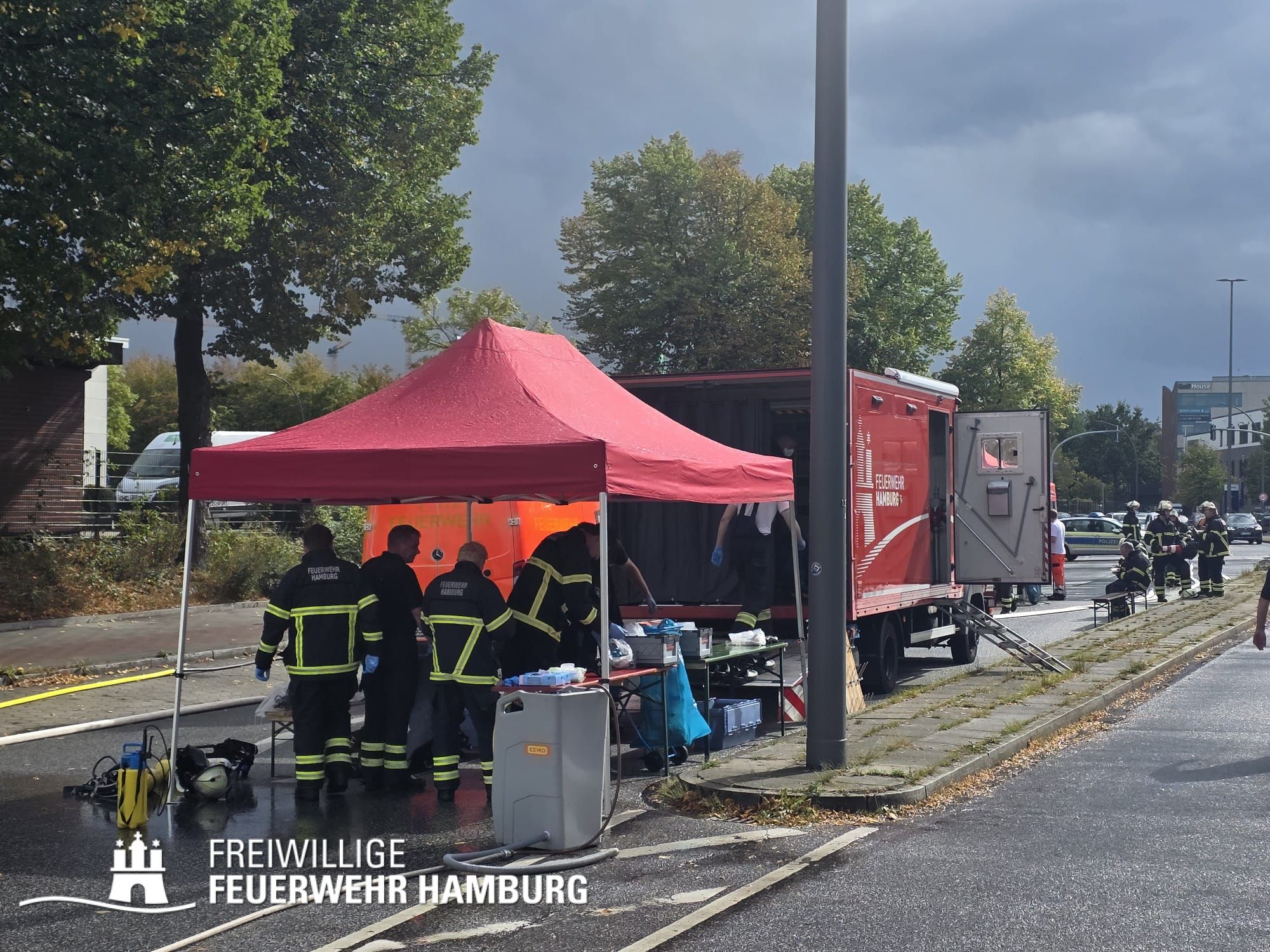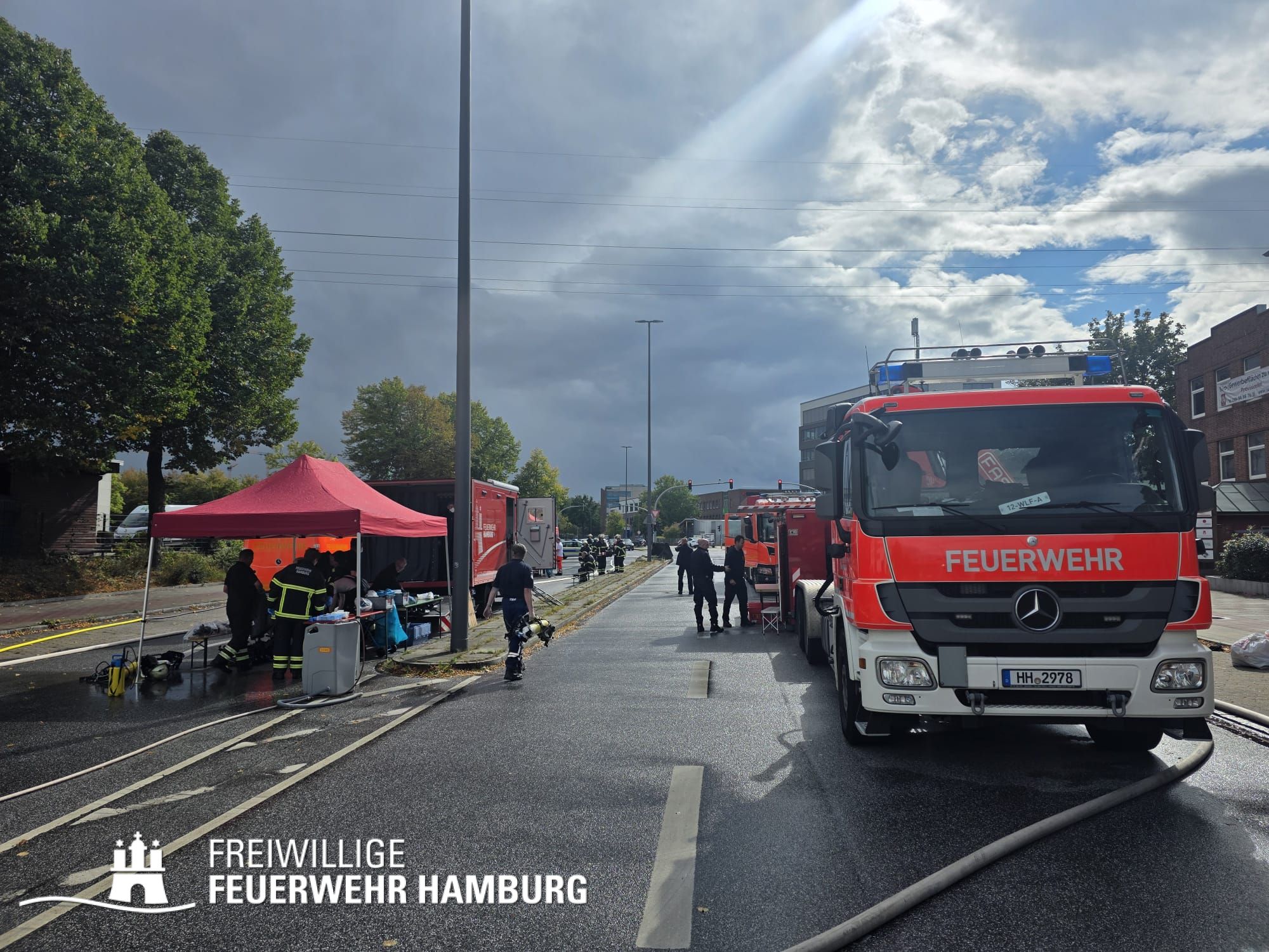 Beim Ablöschen des durch den vom THW aus der Halle beförderten Bauschutt wurden über den Tag die FF Eimsbüttel, Lurup, Osdorf, Berliner Tor, Bergstedt, Fuhlsbüttel und Bille eingesetzt. Für die Versorgung der Kräfte sorgte die FF Eissendorf, welche im späteren Verlauf durch die FF Lemsahl-Mellingstedt abgelöst wurde. Die FF Sinstorf war mit ihrem neuen CBRN-Erkunder zu Messfahrten in der Umgebung im Einsatz.