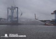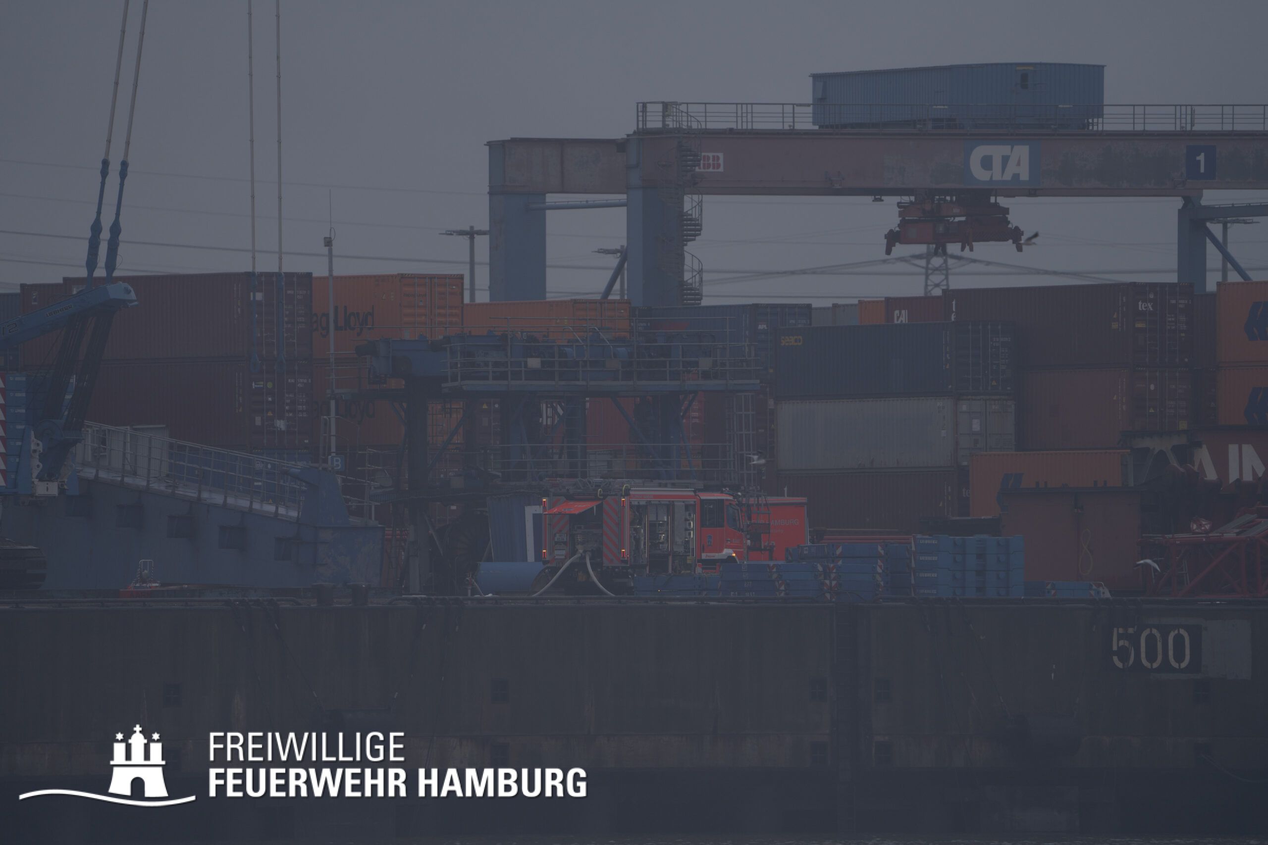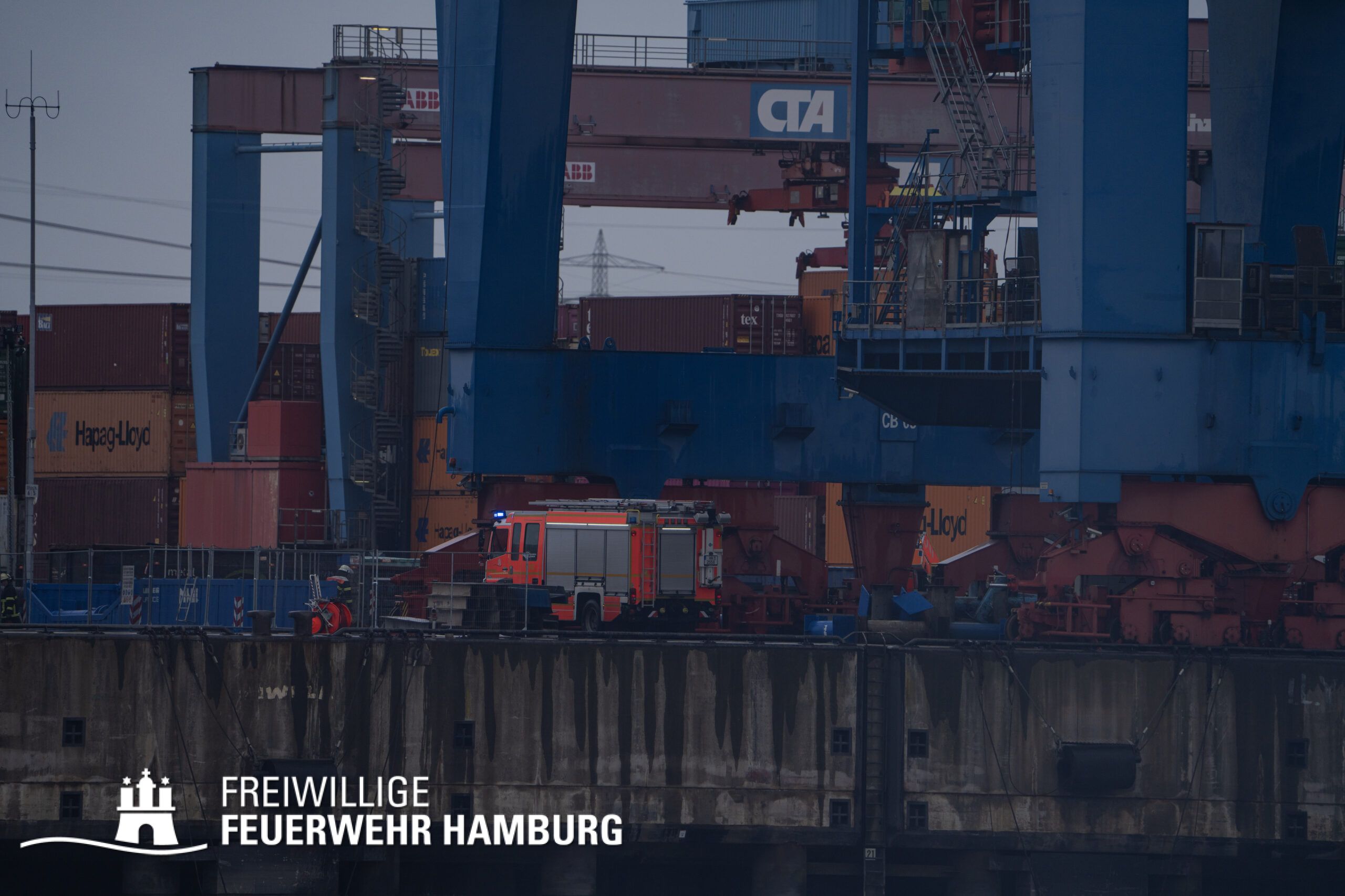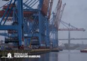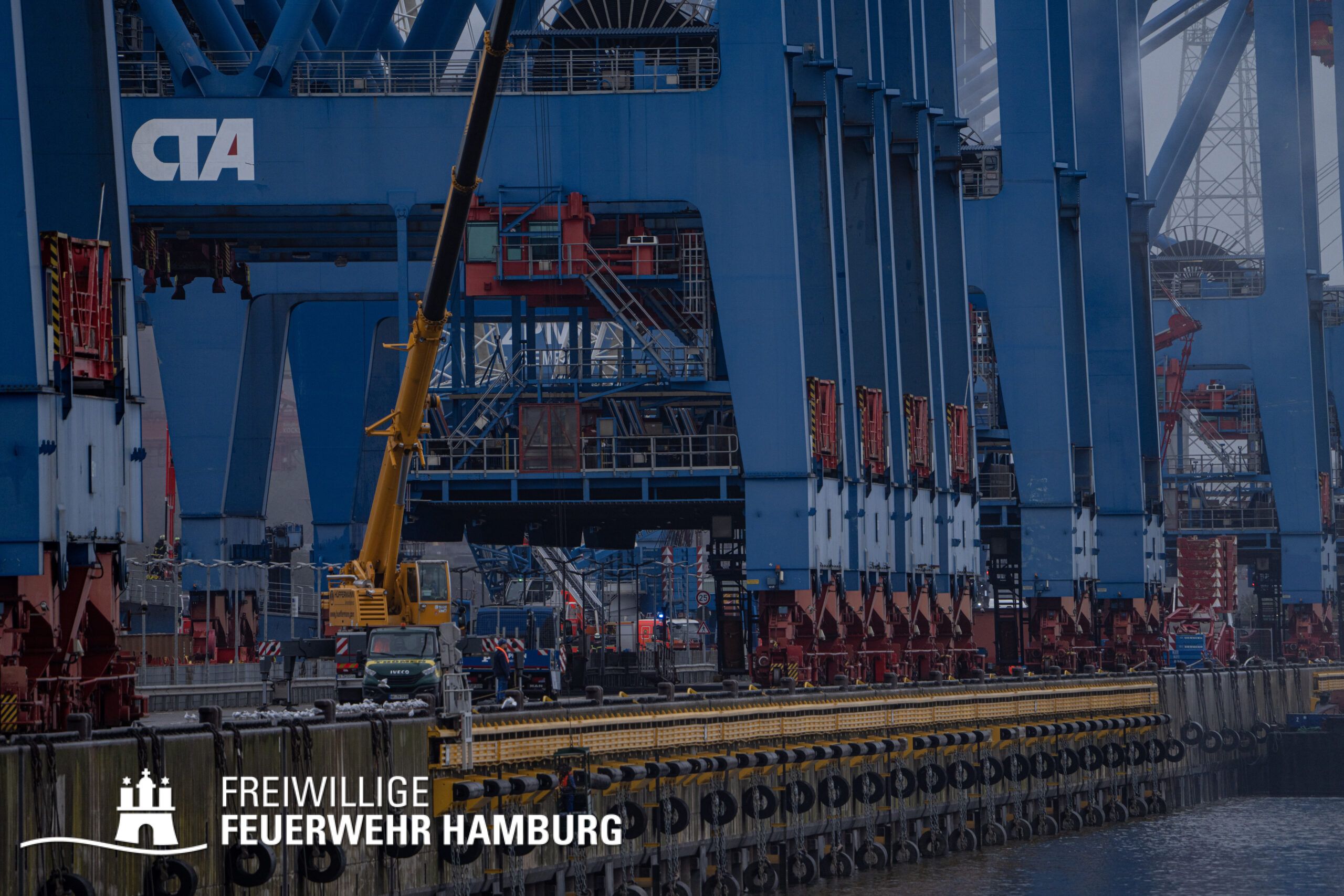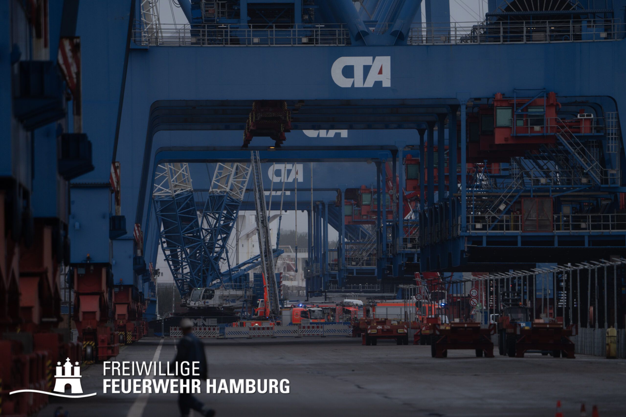 Zur Unterstützung der technischen Arbeiten an der Containerbrücke kam die FF Warwisch zum Einsatz. Schließlich