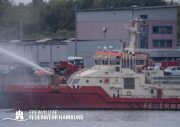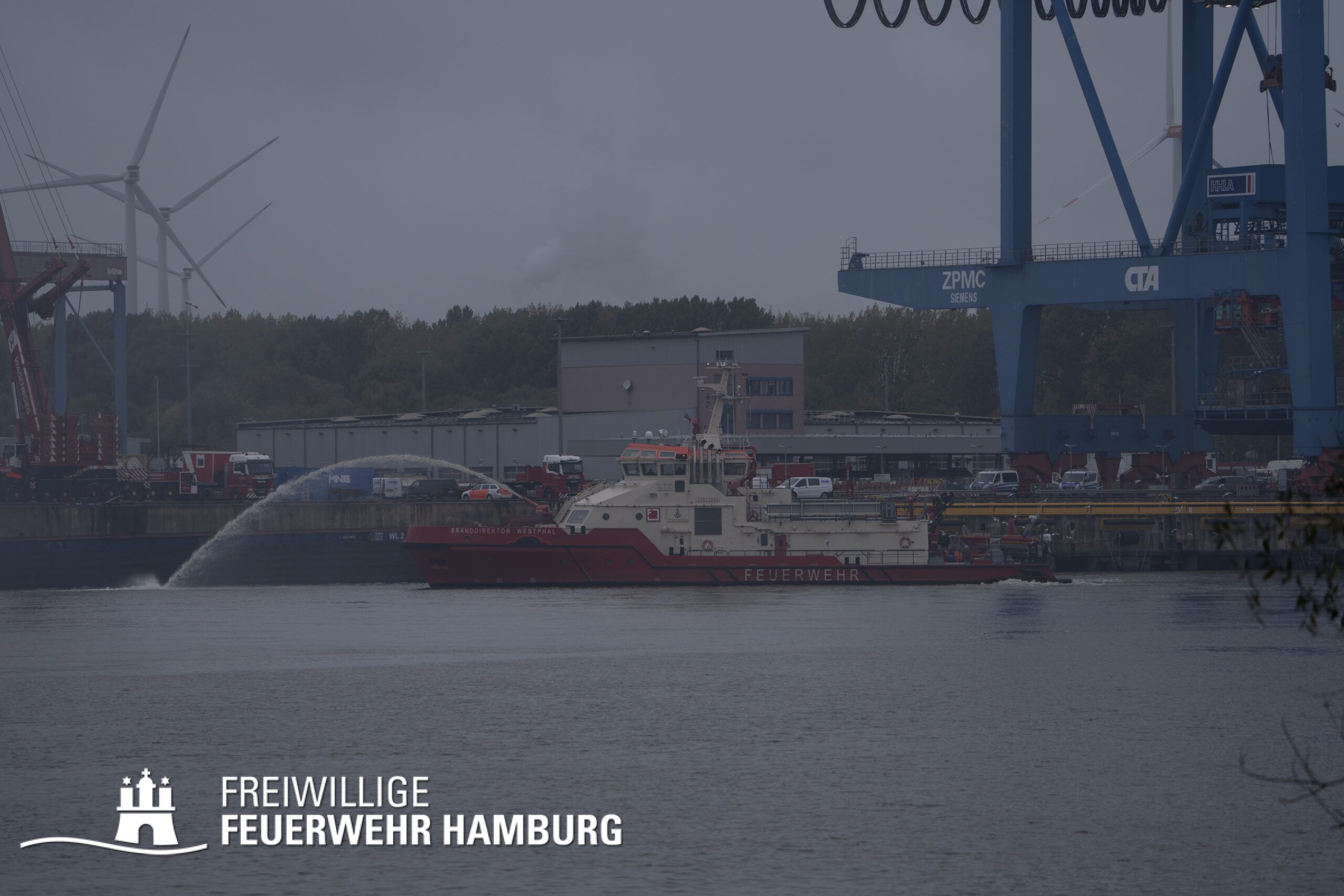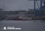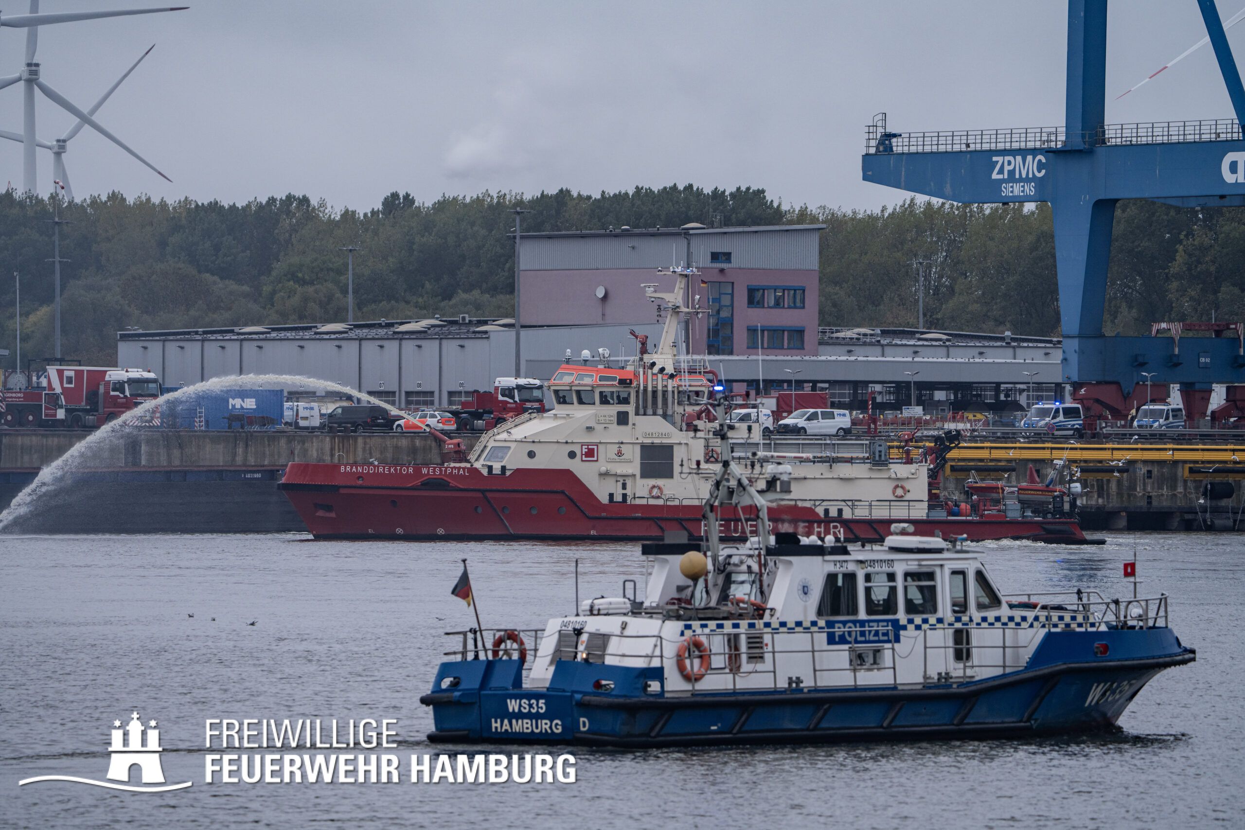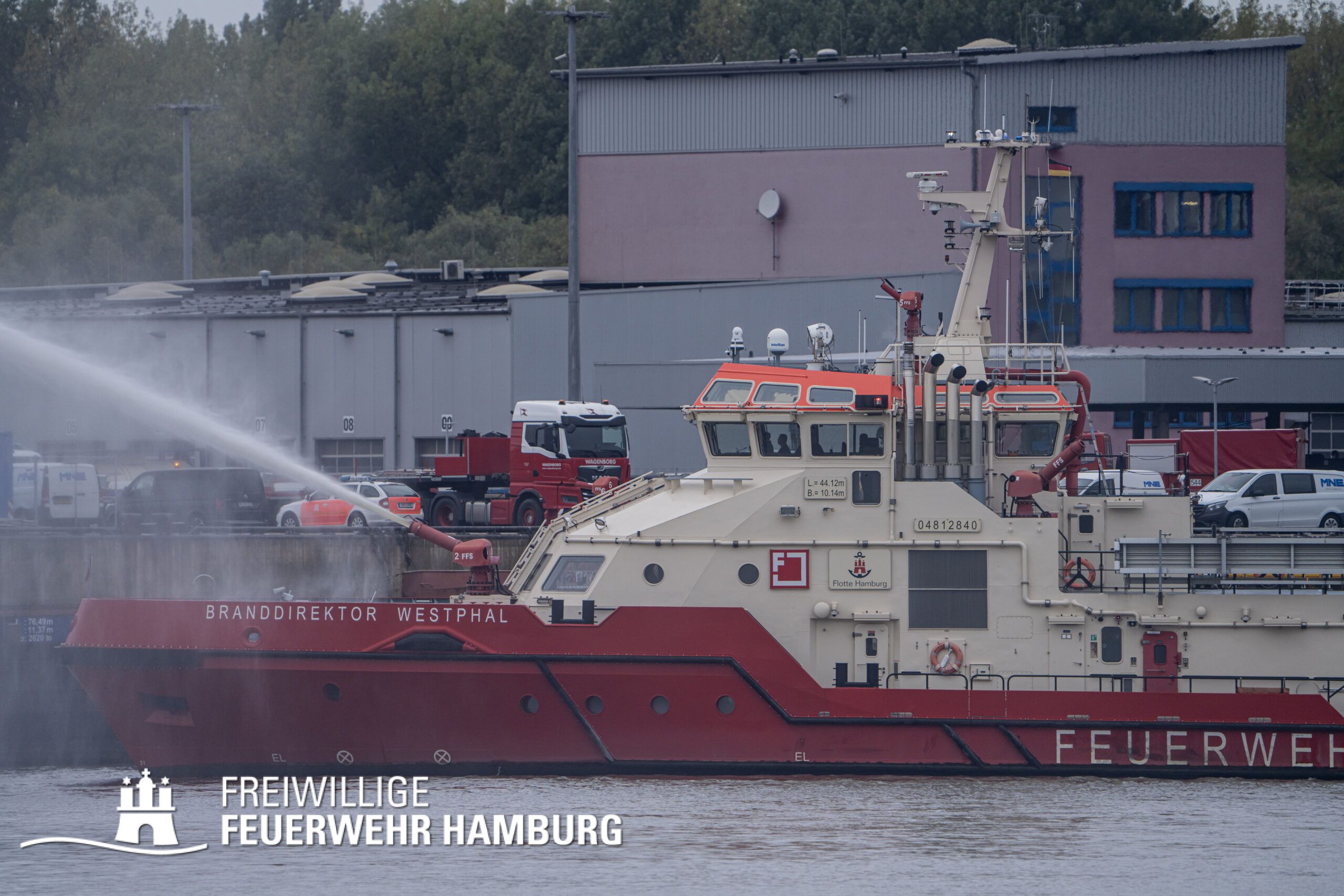 Das Löschboot „Branddirektor Westphal“ nahm die Brandbekämpfung mit einem der an Bord befindlichen