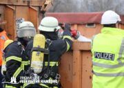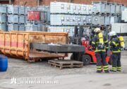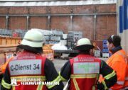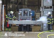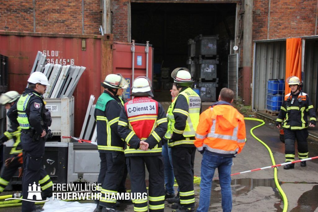 Im weiteren Verlauf wurde der Gefahrgutbehälter durch den Gabelstapler der Feuerwehr unter Atemschutz und ständigen Löschmaßnahmen aus der Halle befördert und in einen Container verbracht, der anschließend mit Wasser geflutet wurde. Die Kräfte des CBRN Zuges der Freiwilligen Feuerwehr waren in Bereitstellung vor Ort. Die FF Rotenburgsort-Veddel und FF Wilhelmsburg unterstützten mit Atemschutzgeräteträgern. Der Bereichsführer Harburg koordinierte vor Ort die Kräfte der Freiwilligen Feuerwehr. Nach ca. 3,5 Stunden war der Einsatz beendet.