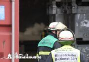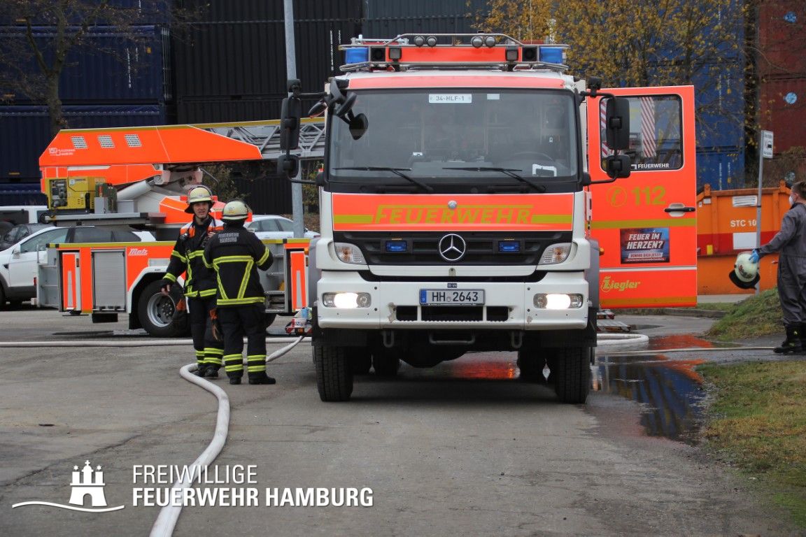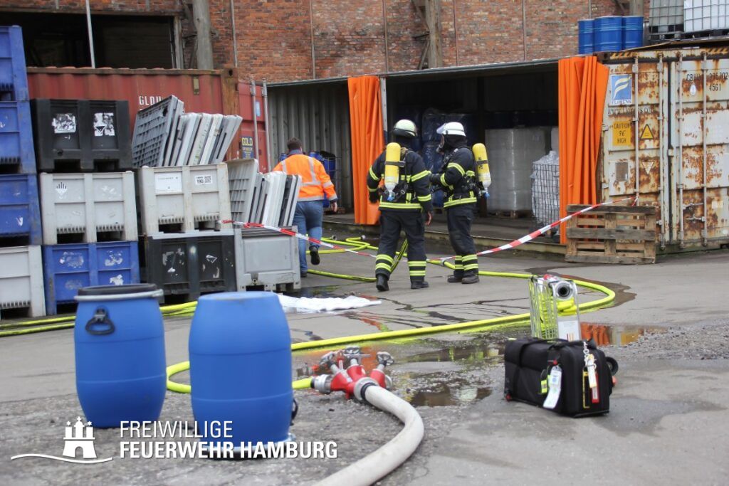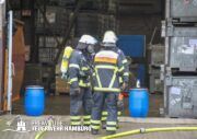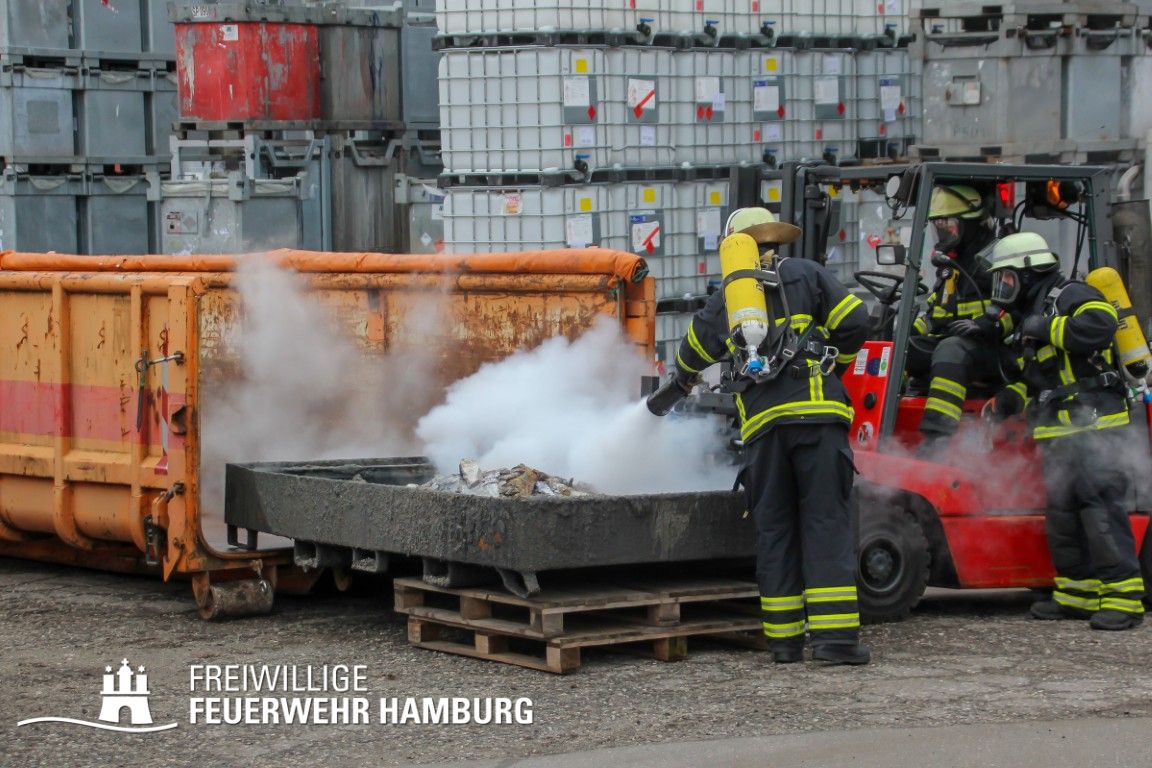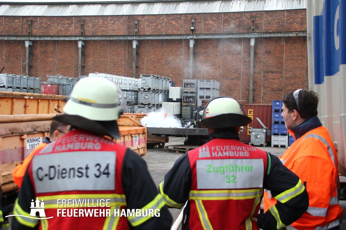 Im weiteren Verlauf wurde der Gefahrgutbehälter durch den Gabelstapler der Feuerwehr unter Atemschutz und ständigen Löschmaßnahmen aus der Halle befördert und in einen Container verbracht, der anschließend mit Wasser geflutet wurde. Die Kräfte des CBRN Zuges der Freiwilligen Feuerwehr waren in Bereitstellung vor Ort. Die FF Rotenburgsort-Veddel und FF Wilhelmsburg unterstützten mit Atemschutzgeräteträgern. Der Bereichsführer Harburg koordinierte vor Ort die Kräfte der Freiwilligen Feuerwehr. Nach ca. 3,5 Stunden war der Einsatz beendet.