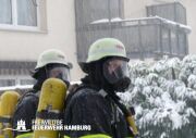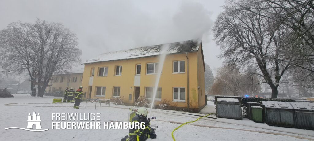 Die als erstes eintreffende FF Sülldorf-Iserbrook setzte sofort einen Trupp im Außenangriff sowie einen Trupp im Innenangriff des betroffenen Gebäudeteils zur Brandbekämpfung ein. Alle Bewohner hatten das Gebäude bereits verlassen. Aufgrund der ersten Rückmeldung nach Lagebeurteilung durch den Wehrführer Sülldorf-Iserbrook erhöhte der Zugführer der BF Osdorf die Alarmstufe. Die Berufsfeuerwehr schickte einen weiteren Trupp in die noch nicht betroffene Haushälfte und stellte einen Sicherheitstrupp. Gemeinsam wurde eine erste Wasserversorgung über vom Schnee bedeckte und deshalb zum Teil schwierig zu findende Unterflurhydranten aufgebaut.