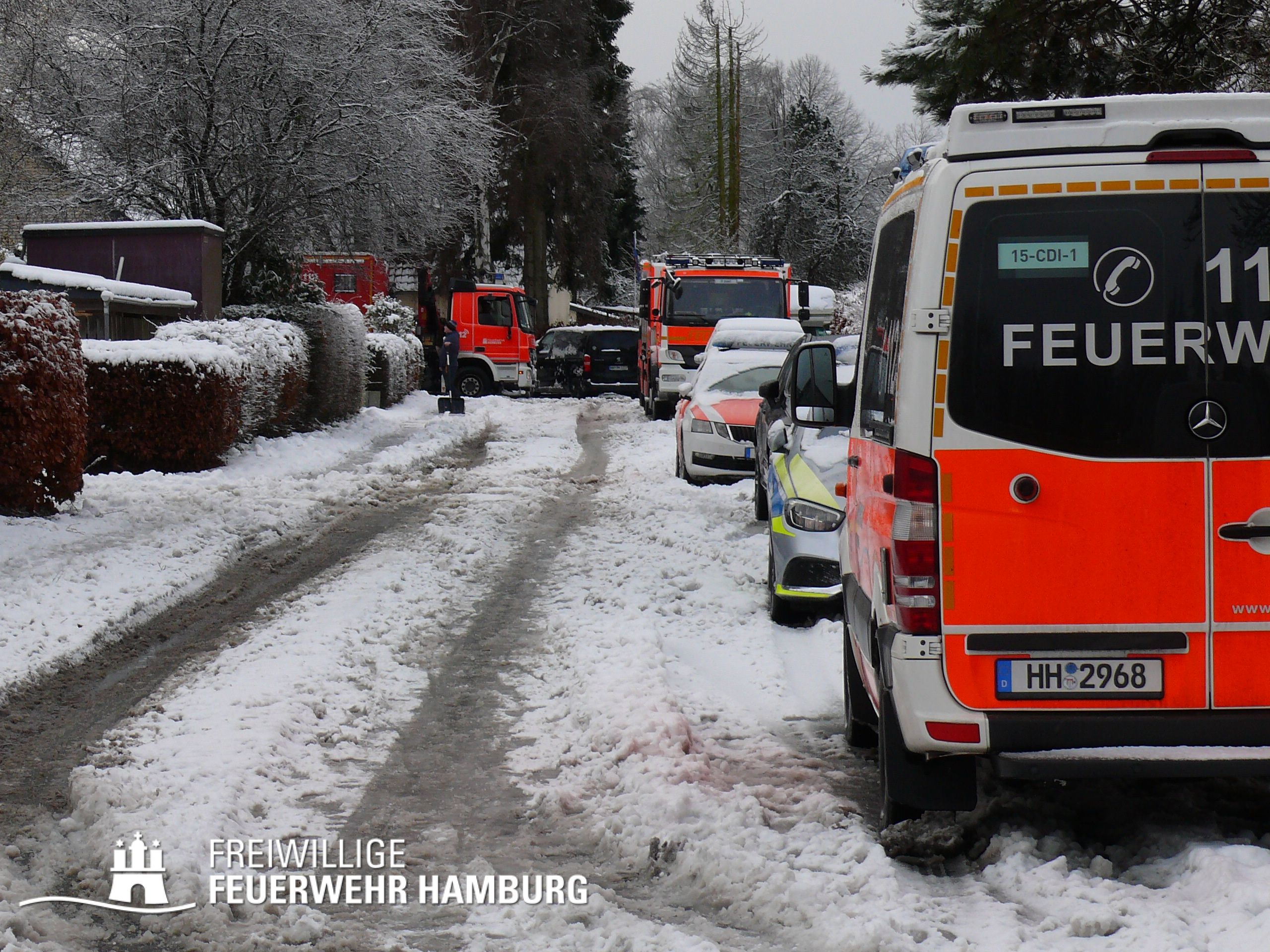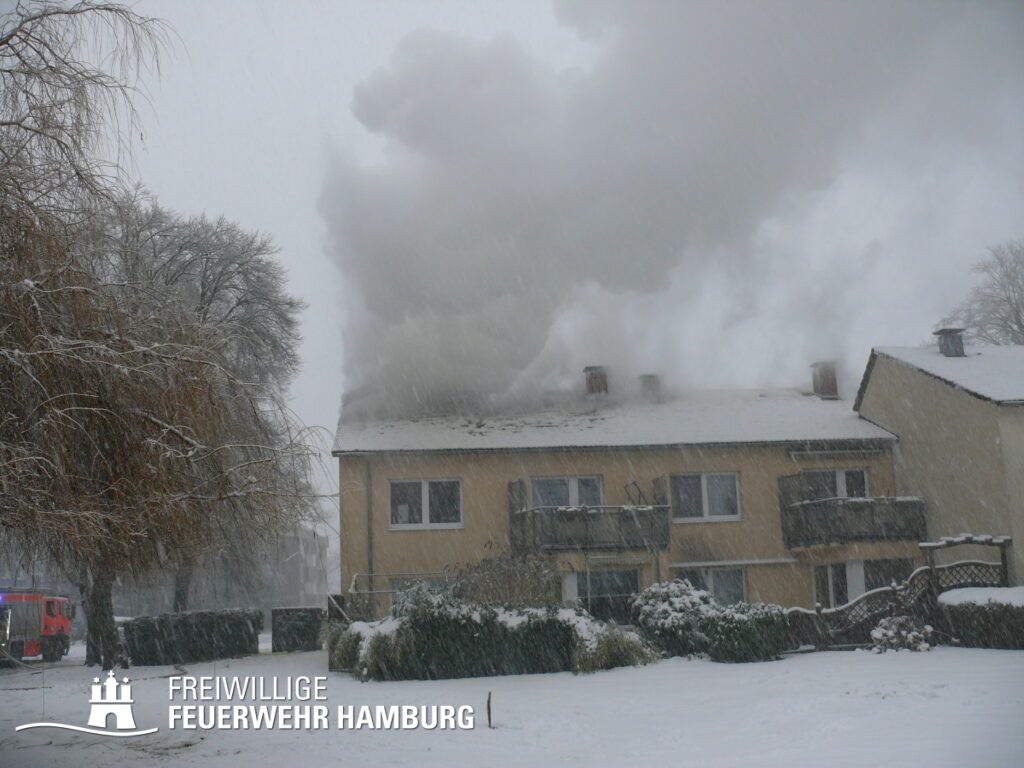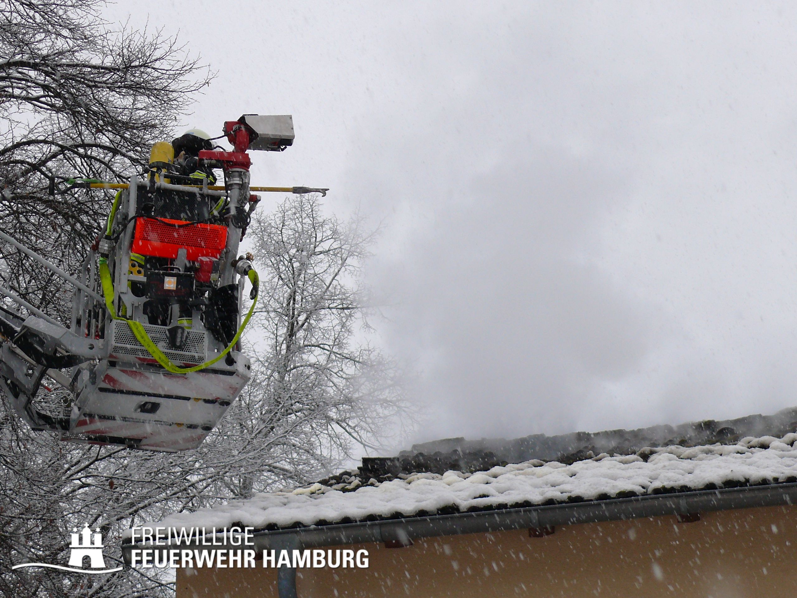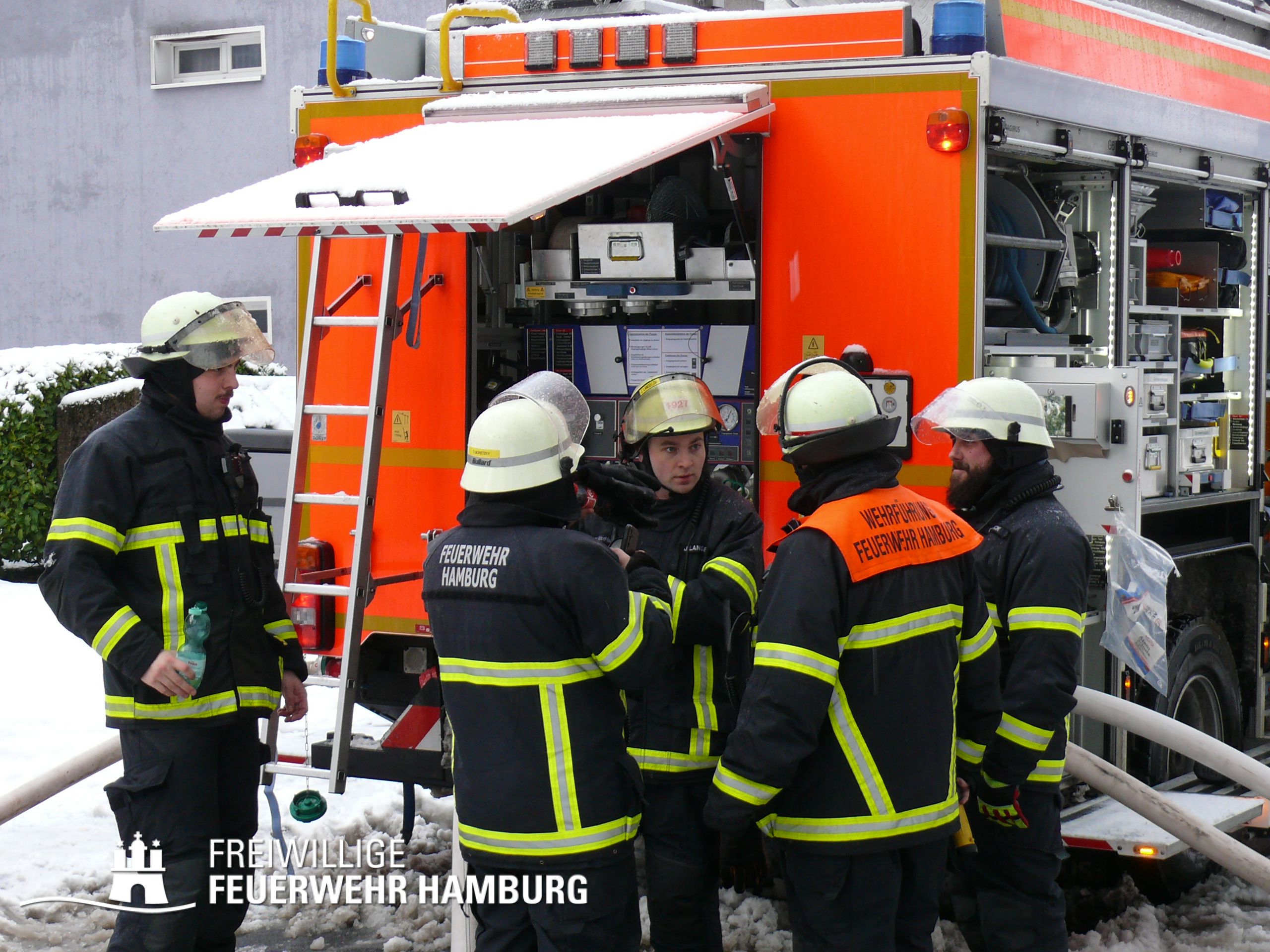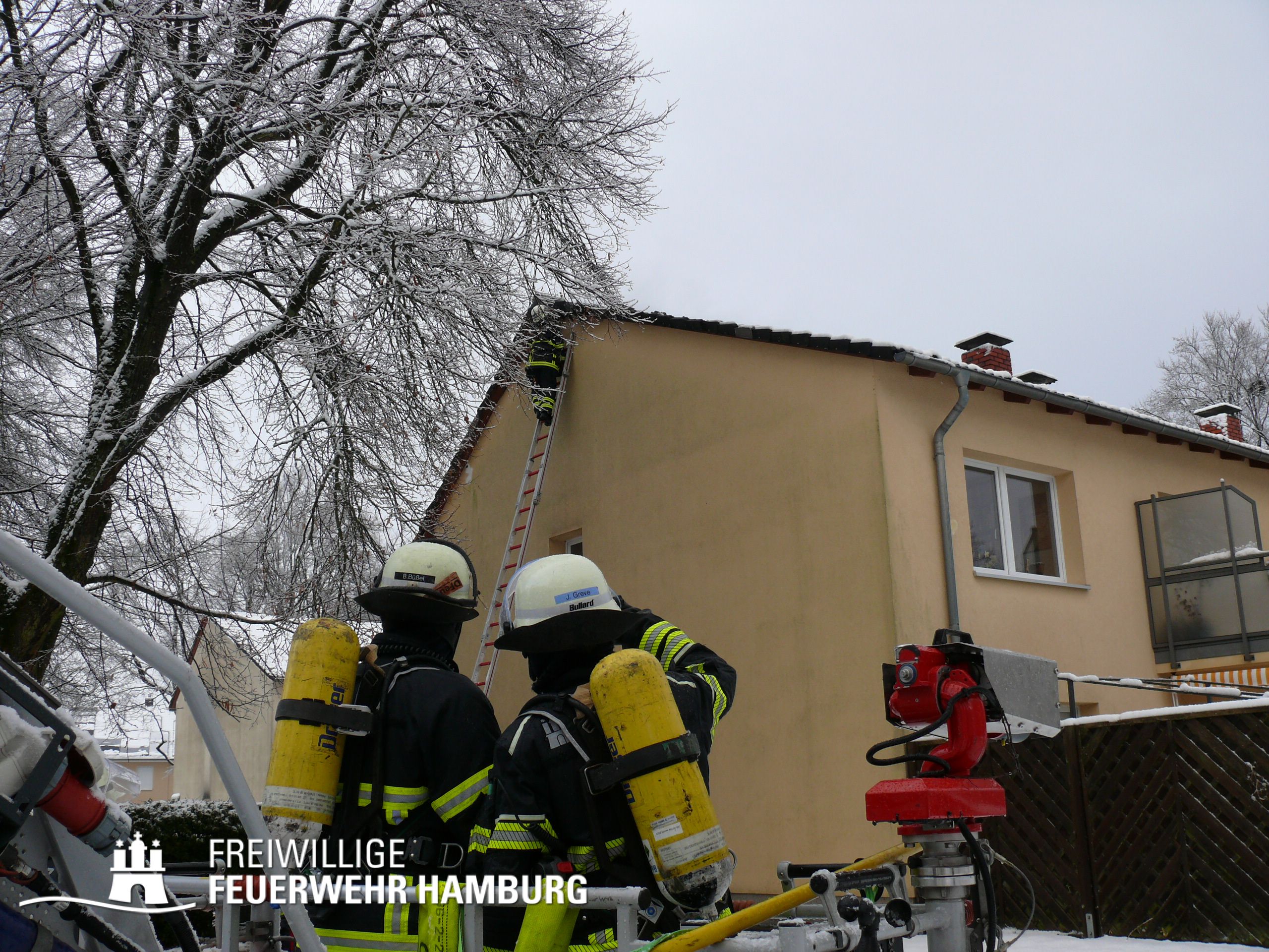 Die als erstes eintreffende FF Sülldorf-Iserbrook setzte sofort einen Trupp im Außenangriff sowie einen Trupp im Innenangriff des betroffenen Gebäudeteils zur Brandbekämpfung ein. Alle Bewohner hatten das Gebäude bereits verlassen. Aufgrund der ersten Rückmeldung nach Lagebeurteilung durch den Wehrführer Sülldorf-Iserbrook erhöhte der Zugführer der BF Osdorf die Alarmstufe. Die Berufsfeuerwehr schickte einen weiteren Trupp in die noch nicht betroffene Haushälfte und stellte einen Sicherheitstrupp. Gemeinsam wurde eine erste Wasserversorgung über vom Schnee bedeckte und deshalb zum Teil schwierig zu findende Unterflurhydranten aufgebaut.