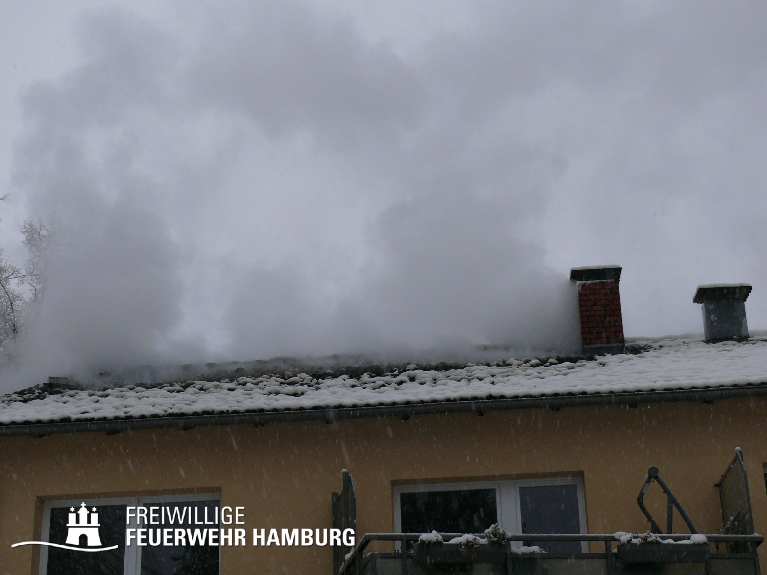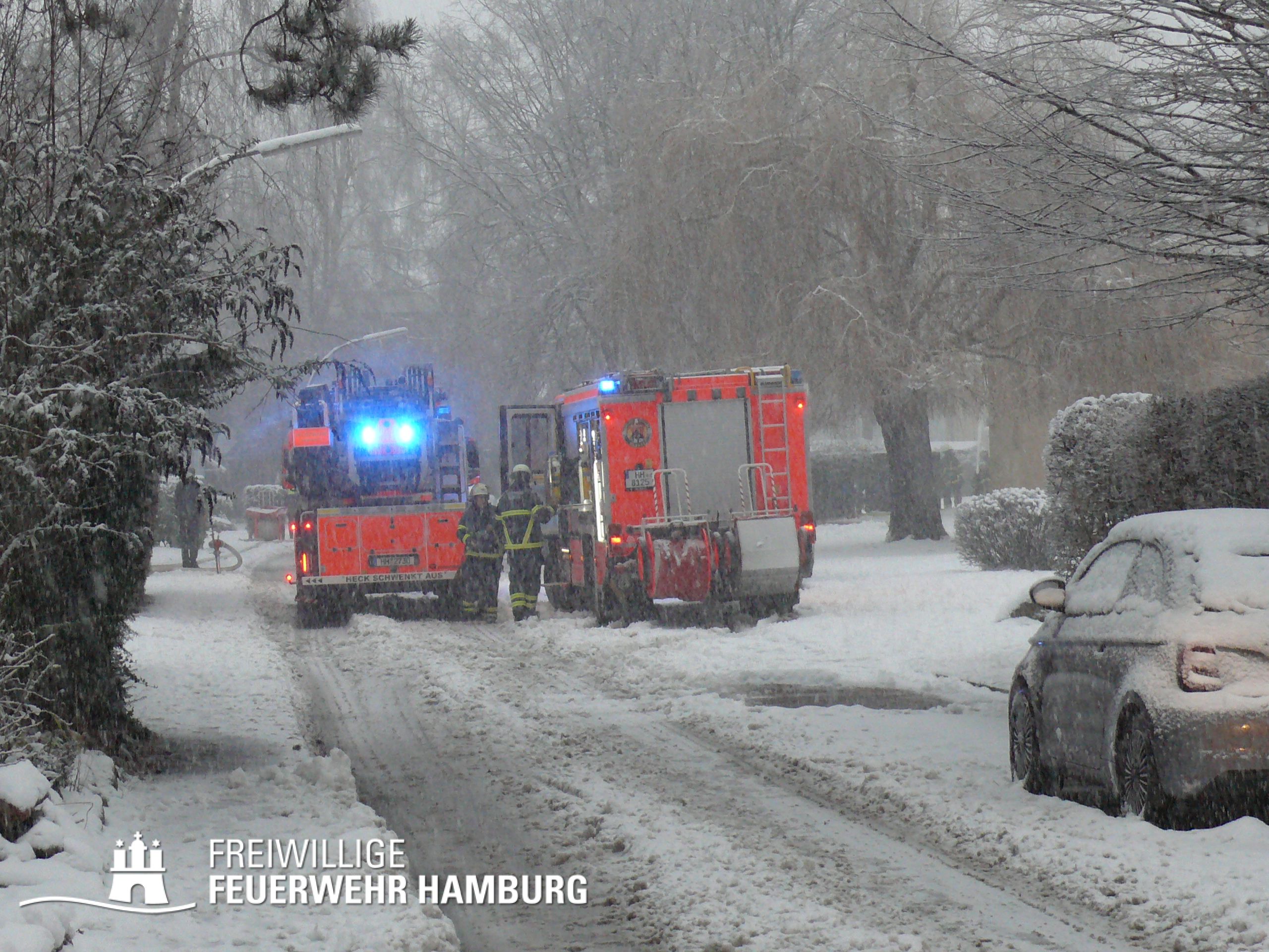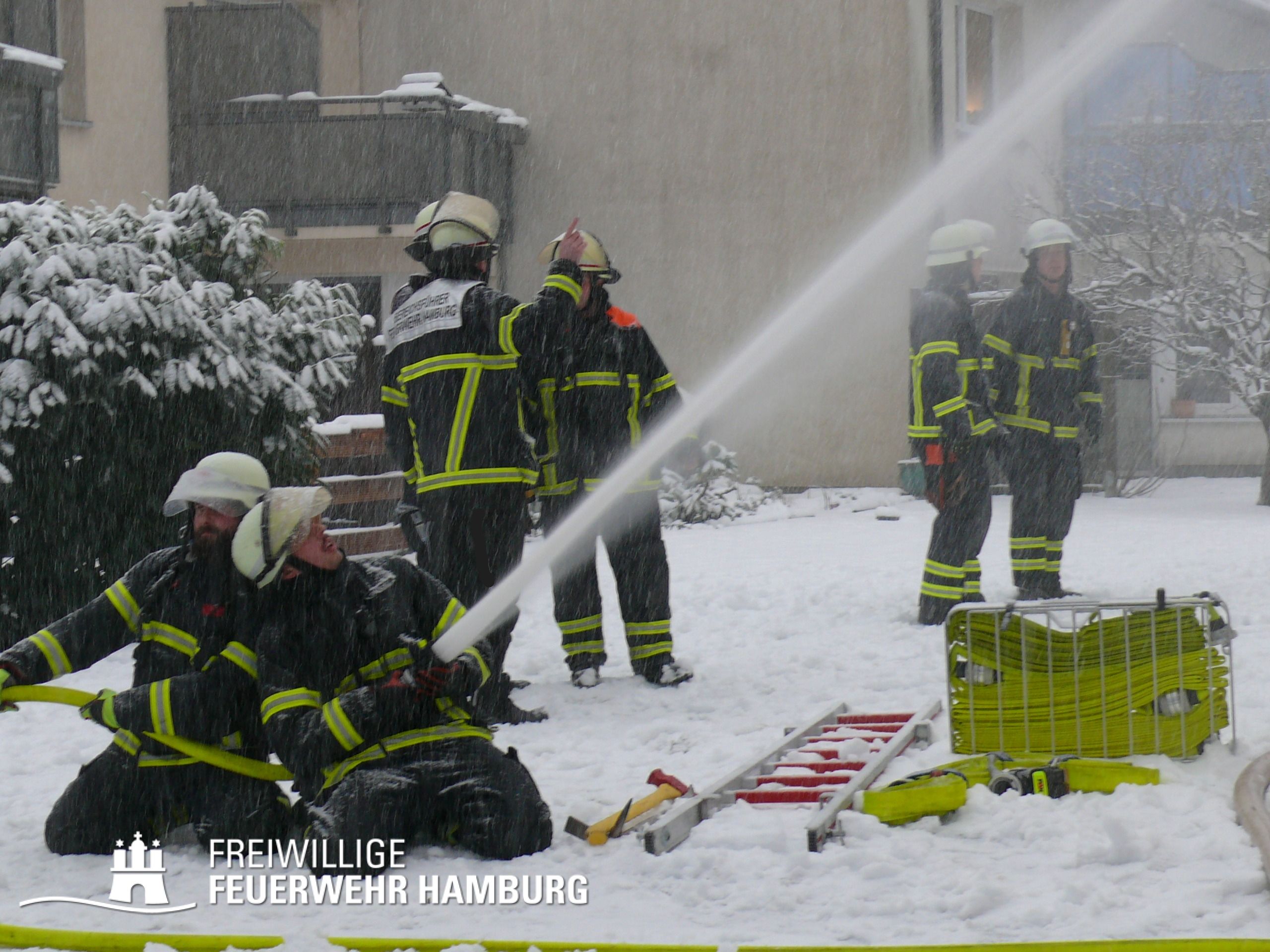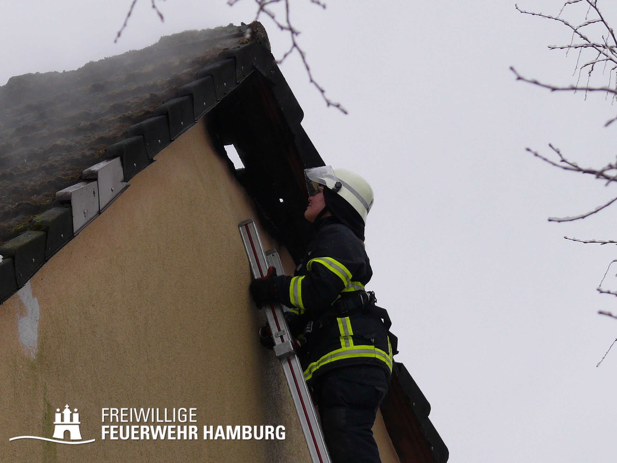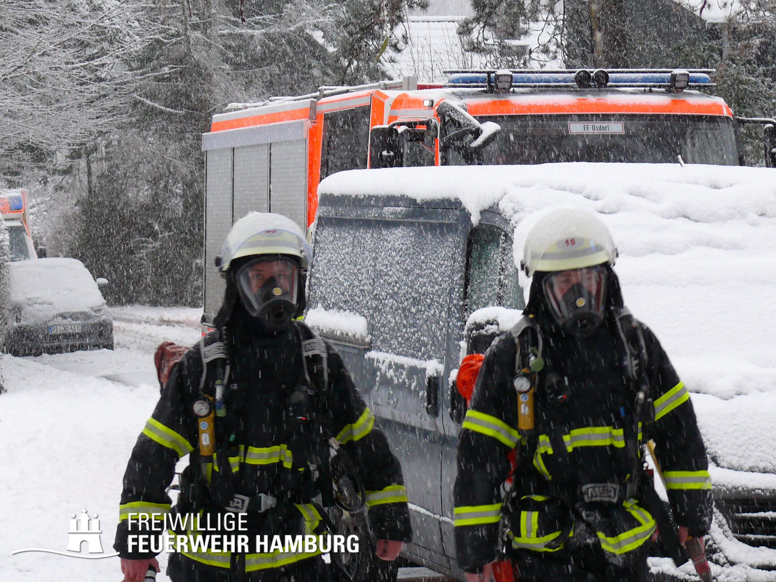 Die als erstes eintreffende FF Sülldorf-Iserbrook setzte sofort einen Trupp im Außenangriff sowie einen Trupp im Innenangriff des betroffenen Gebäudeteils zur Brandbekämpfung ein. Alle Bewohner hatten das Gebäude bereits verlassen. Aufgrund der ersten Rückmeldung nach Lagebeurteilung durch den Wehrführer Sülldorf-Iserbrook erhöhte der Zugführer der BF Osdorf die Alarmstufe. Die Berufsfeuerwehr schickte einen weiteren Trupp in die noch nicht betroffene Haushälfte und stellte einen Sicherheitstrupp. Gemeinsam wurde eine erste Wasserversorgung über vom Schnee bedeckte und deshalb zum Teil schwierig zu findende Unterflurhydranten aufgebaut.