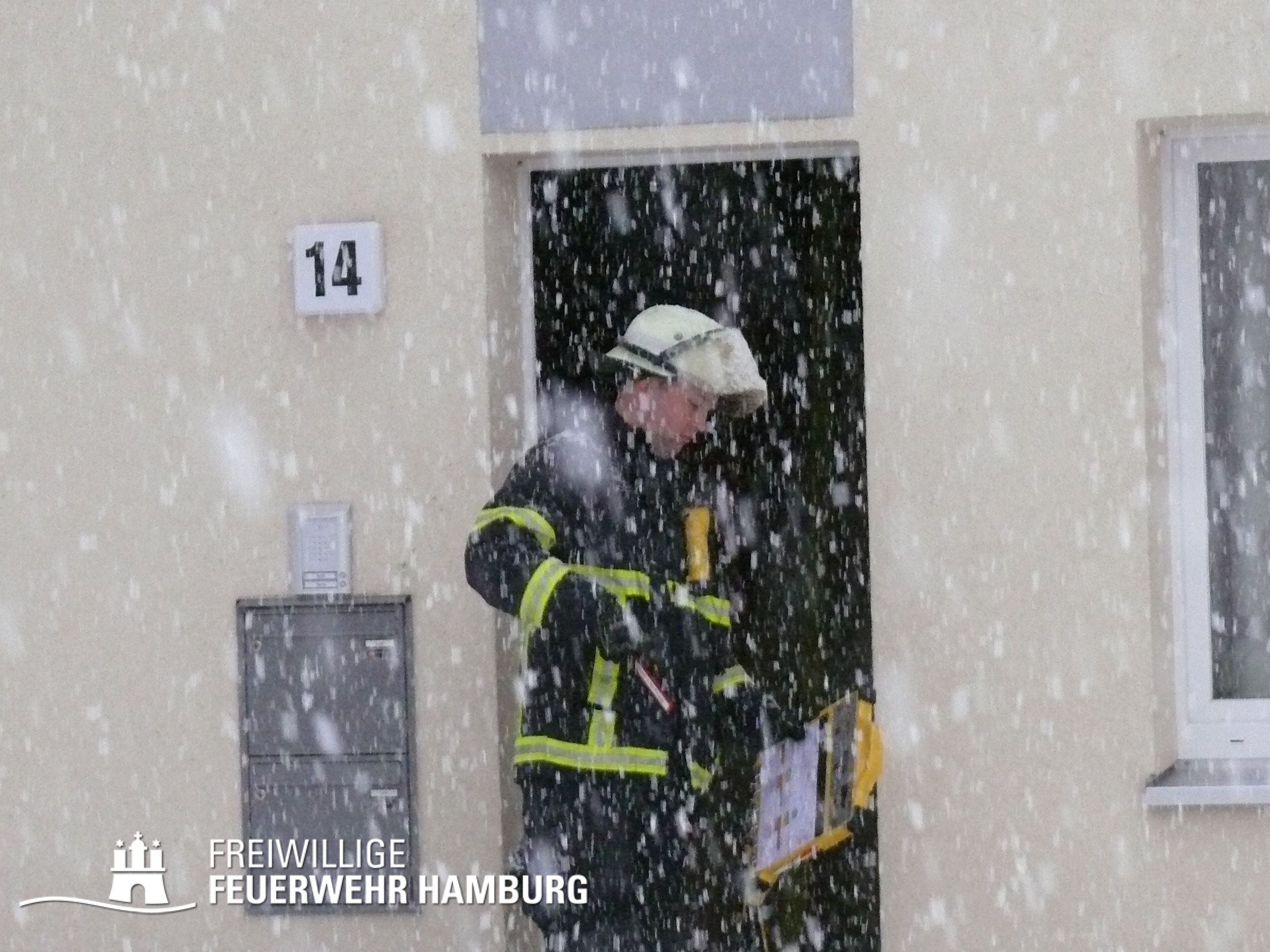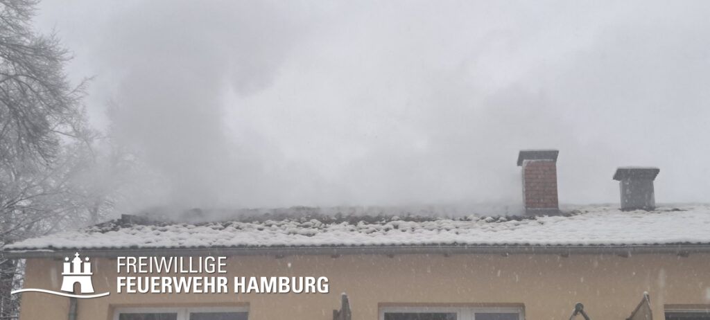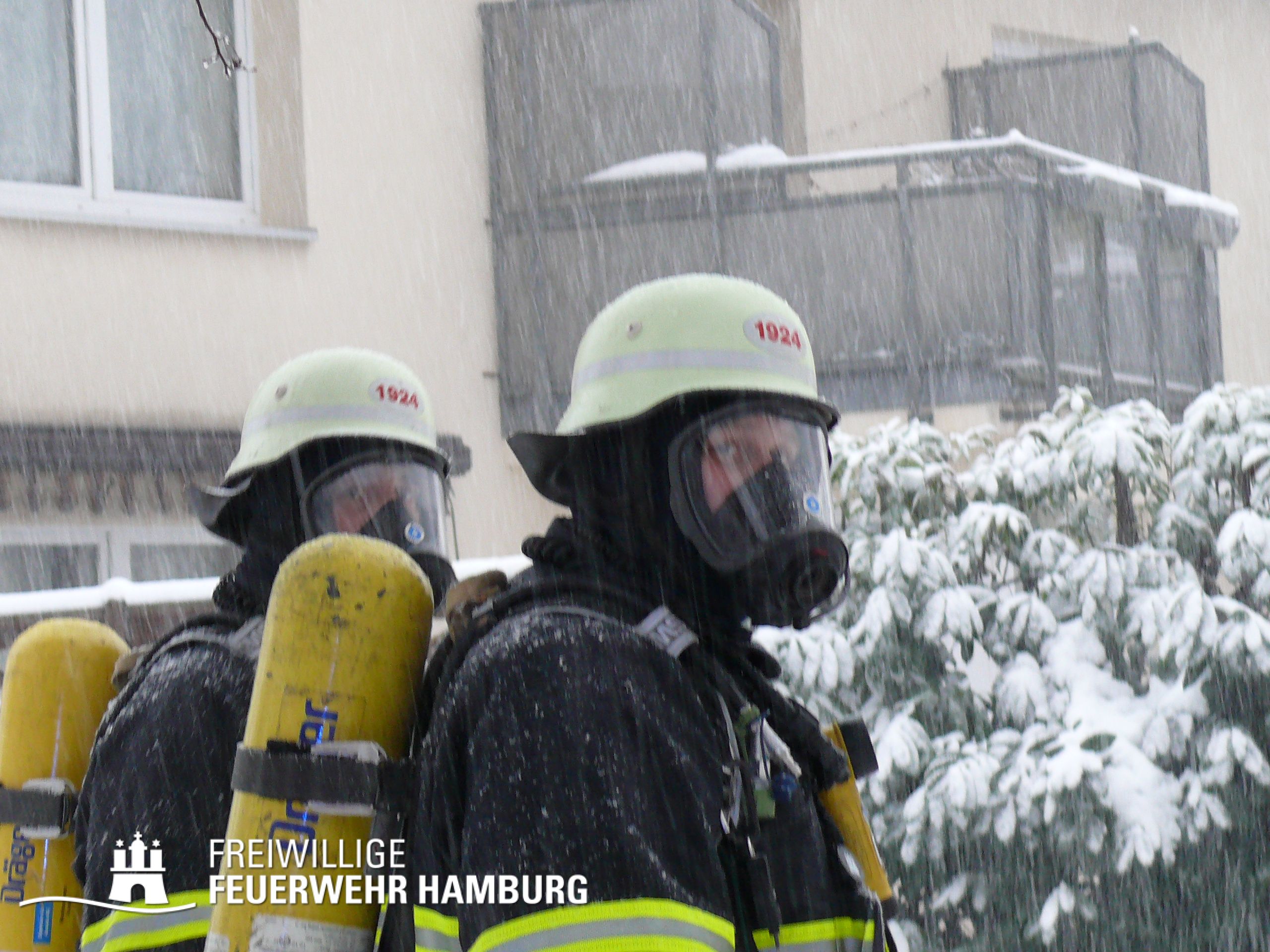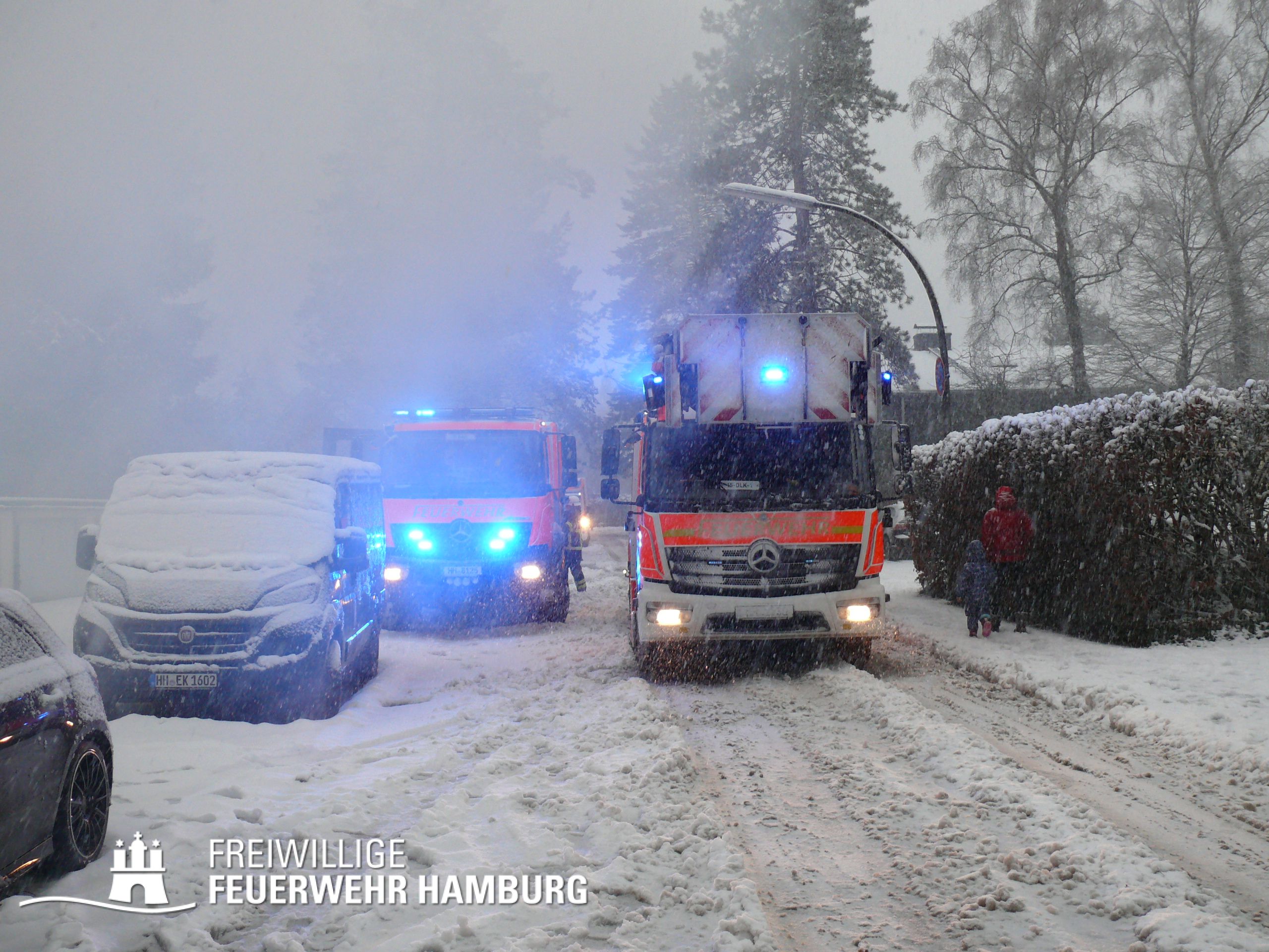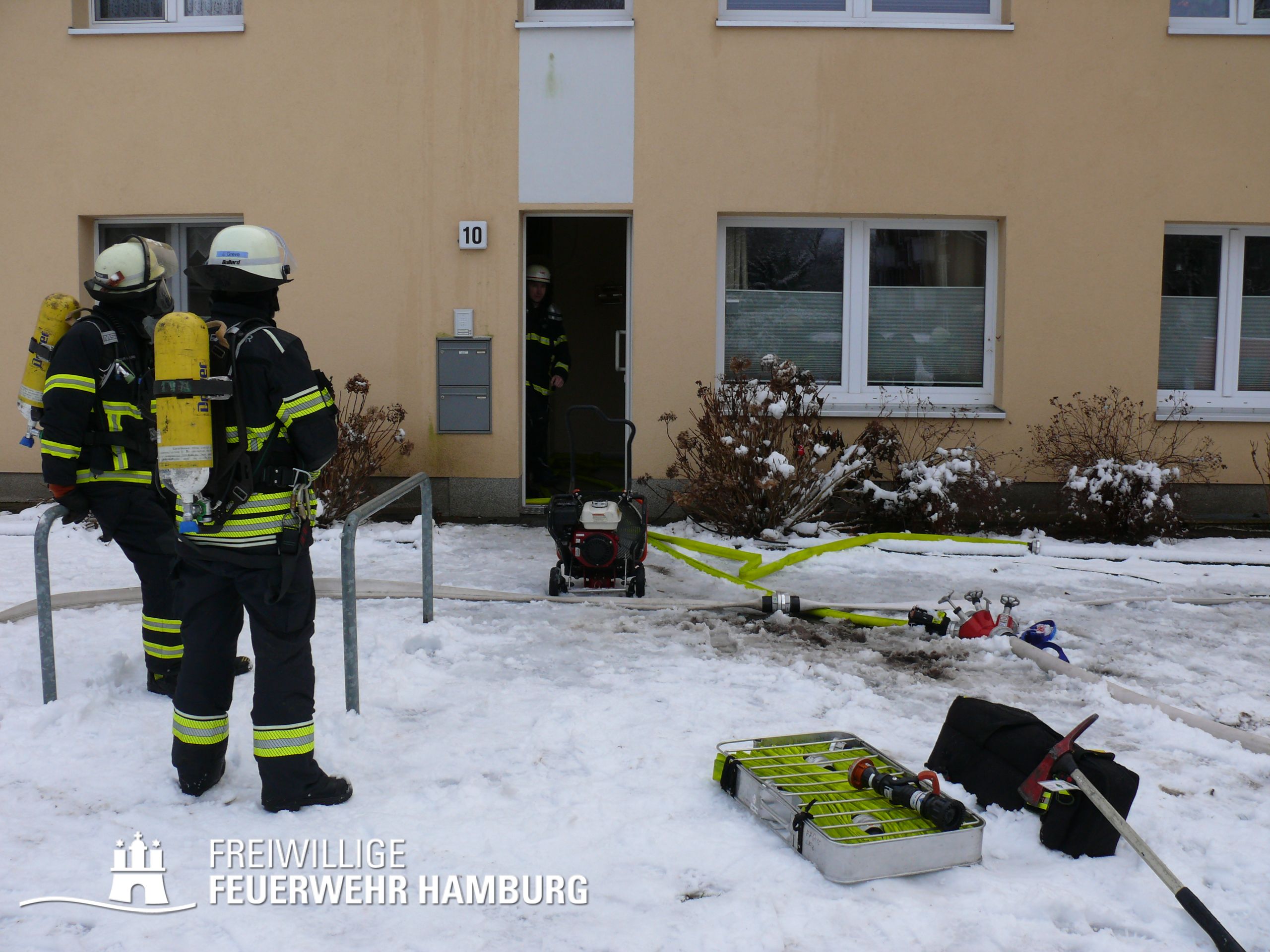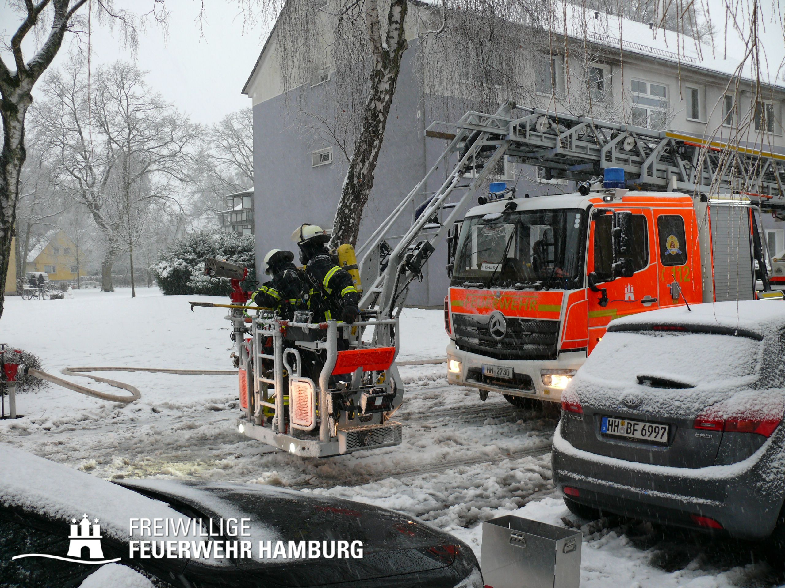 Die als erstes eintreffende FF Sülldorf-Iserbrook setzte sofort einen Trupp im Außenangriff sowie einen Trupp im Innenangriff des betroffenen Gebäudeteils zur Brandbekämpfung ein. Alle Bewohner hatten das Gebäude bereits verlassen. Aufgrund der ersten Rückmeldung nach Lagebeurteilung durch den Wehrführer Sülldorf-Iserbrook erhöhte der Zugführer der BF Osdorf die Alarmstufe. Die Berufsfeuerwehr schickte einen weiteren Trupp in die noch nicht betroffene Haushälfte und stellte einen Sicherheitstrupp. Gemeinsam wurde eine erste Wasserversorgung über vom Schnee bedeckte und deshalb zum Teil schwierig zu findende Unterflurhydranten aufgebaut.