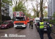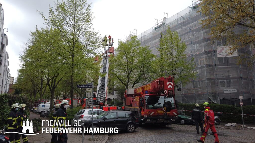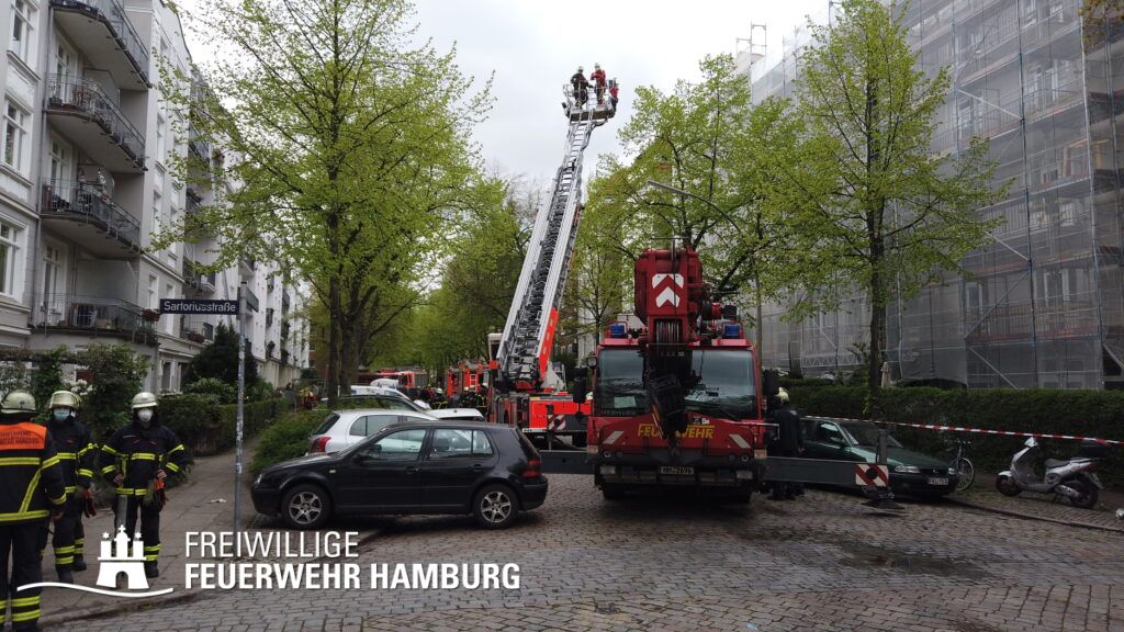 In Stellingen ist am 12.05.2021 in einem 5-geschossigen Mehrfamilienhaus im Dachbereich ein Feuer ausgebrochen. Auf Grund der Größe des Feuers wurde die Alarmstufe zügig erhöht, um die Brandbekämpfung von mehreren Seiten einleiten zu können. In der Spitze waren ca. 120 Einsatzkräfte der Berufs- und Freiwilligen Feuerwehr Hamburg zeitgleich am Einsatzort.