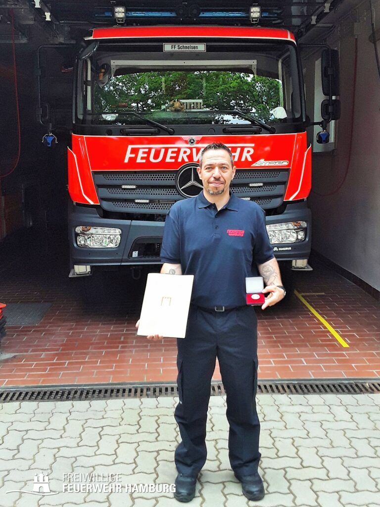 Der Kamerad Denny Gumprecht konnte sein Engagement im Laufe seiner Dienstzeit bei verschiedenen Wehren einbringen. Seine ehrenamtliche Tätigkeit begann 1992 mit dem Eintritt in die FF Bobbau in Sachsen-Anhalt (ST). Dort war er dann bereits von 2004 bis 2007 als Wehrführer aktiv. Im Jahr 2007 erfolgte ein Wechsel in die FF Sandersdorf (ST). Nach Hamburg kam dann der Jubilar 2013 zur FF Harburg. Dort übte er von 2017 bis 2019 das Amt als Wehrführer-Vertreter aus. Seit 2019 ist er nun in der FF Schnelsen.