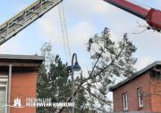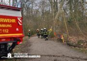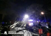 Das Sturmtief Nadia traf am Samstag gegen 17 Uhr auf Hamburg und sorgte für reichlich Schäden und Verkehrschaos durch umgestürzte Bäume und andere Gegenstände. Auch eine Sturmflut rollte auf Hamburg zu, welche ebenfalls für einige Einsätze sorgte. Bei den meisten Einsätzen handelte es sich um umgestürzte Bäume oder abgebrochene Äste, welche sich auf Straßen, Fahrzeugen, Häusern oder Bahnstrecken befanden. Es gab diverse größere Lagen bei denen Bereichsführer und die Sonderkomponenten Schwere Technische Hilfeleistung mit ihren Spezialfahrzeugen und die Ortswehren mit ihren GW-R1 oder RW 1 angefordert wurden. Im Bereich Bergedorf und Hausbruch kam es zu Störungen im Bahnverkehr durch umgestürzte Bäume auf Bahngleisen. Am Anleger Teufelsbrück ließ sich ein Flutschutztor nicht schließen, gemeinsam mit dem THW bereitete man sich auf einen Sandsack-Einsatz vor, welcher zum Glück nicht nötig war, da es der Feuerwehr schlussendlich doch gelang das Tor zu schließen. Eine sehr schwierige Lage entwickelte sich an der Freihafen Brücke. Dort verkeilte sich eine Schute mit Bagger unter der Brücke. Hier waren einige Kleinboote der Freiwilligen Feuerwehr eingesetzt, da sich auch noch zwei Personen auf dem Boot befanden welche gerettet werden konnten. Kurz nach Mitternacht meldeten Anrufer diverse PKWs im Wasser in der Hafencity, da die Lichter der Fahrzeuge leuchteten, ging man von Personen in den Fahrzeugen aus, sodass mehr Einsatzkräfte inklusive Taucher an die Einsatzstelle alarmiert wurden. Glücklicherweise bestätigte sich der Verdacht nicht. Auch zu gelösten Baugerüsten wurden einige Wehren alarmiert, wie zum Beispiel in Steilshoop. Hier flogen mehrere Bau- und Gerüstteile vom Dach eines 8-geschossigem Mehrfamilienhauses. Im Verlauf des Sonntages kam es zu weiteren schweren Sturmboen, bei denen die Wehren wieder gefordert waren. Es kam ebenfalls zu einem erhöhten Einsatzaufkommen mit umgestürzten Bäumen und Schäden an Dächern.
