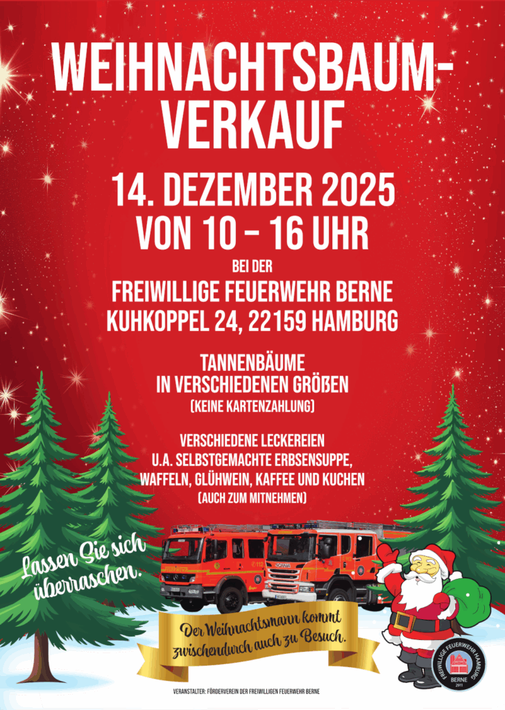 Wir freuen uns, in diesem Jahr erstmals einen Tannenbaumverkauf bei uns im Feuerwehrhaus anbieten zu können. Am 14. Dezember 2025 von 10-16 Uhr können Sie sich in der Kuhkoppel 24 Ihren Christbaum aussuchen.