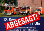 Bekanntermaßen unterstützt die Feuerwehr Hamburg bei der temporären Unterbringung von Flüchtlingen an unserer Feuerwehrakademie. Da ein Ende dieser unterstützenden Maßnahme zum jetzigen Zeitpunkt bedingt durch weiterhin hohe Flüchtlingszahlen nicht verlässlich absehbar ist, hat sich die Feuerwehr Hamburg dazu entschlossen, den für den 12. September geplanten „Hamburger Feuerwehrtag“ an der Feuerwehrakademie abzusagen.