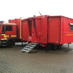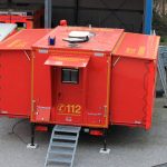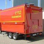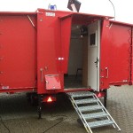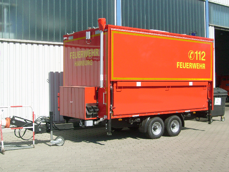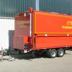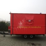 | Der Fw-Anhänger Führung und Lage (FwA-FüLa) wurde als Falt-Container auf einem Tandem-Achsanhänger aufgebaut. Die beiden Seiten des Containers können aufgeklappt werden, so dass ein ca. 20 qm großer mobiler Führungs- und Lageraum zur Verfügung steht. |