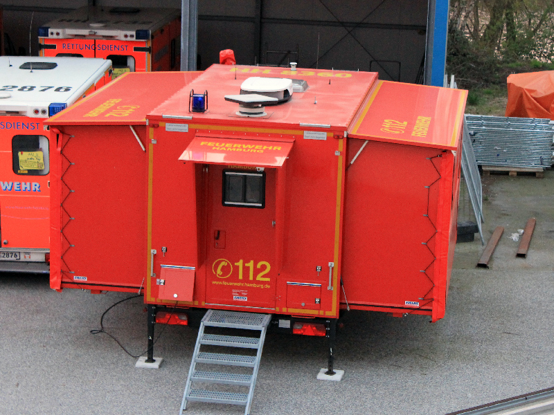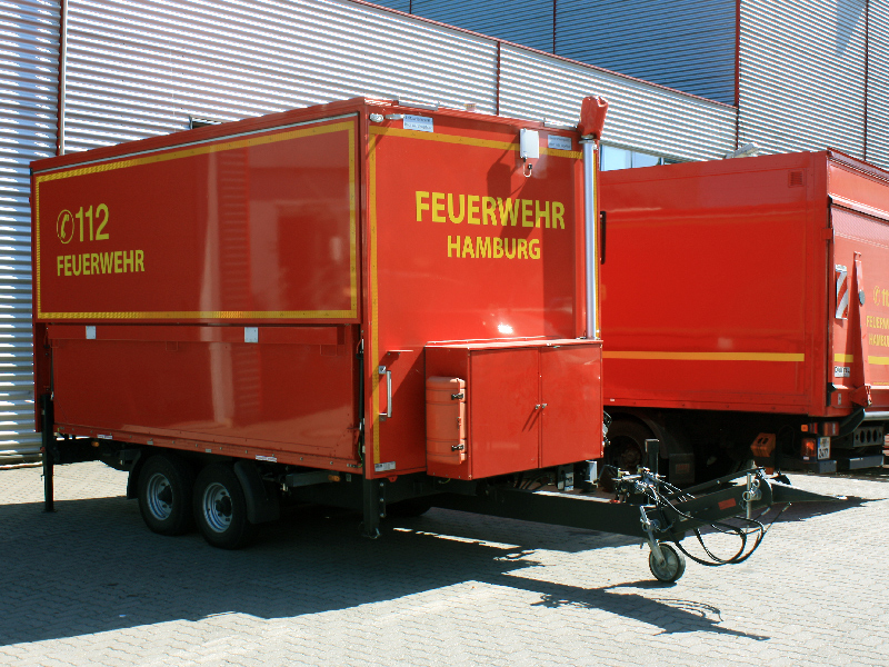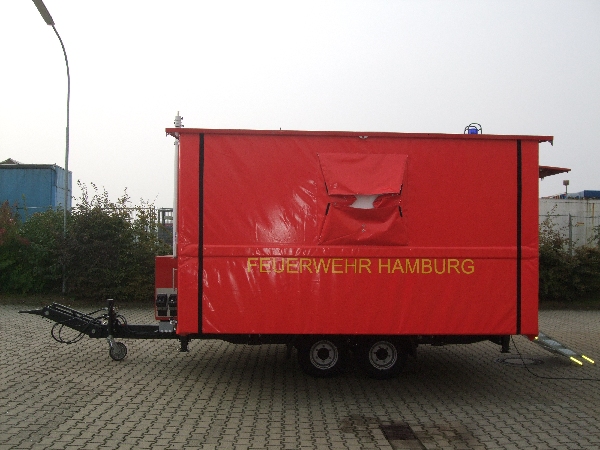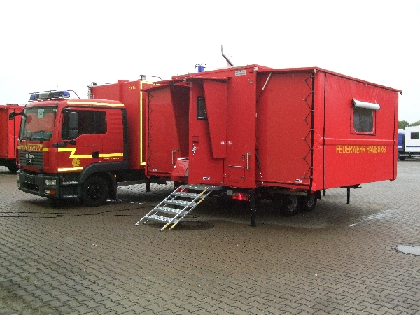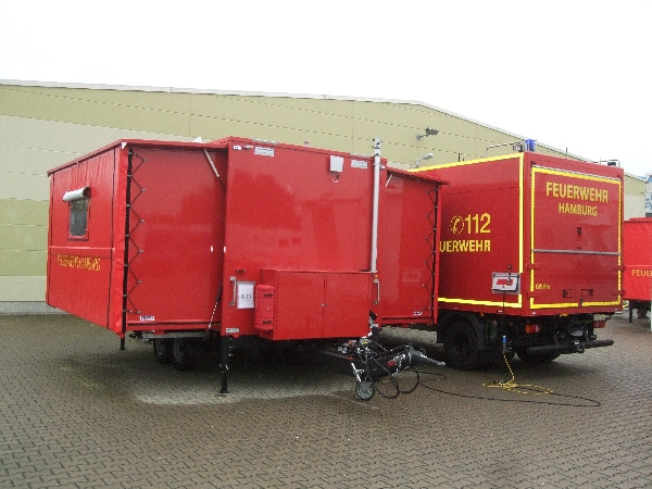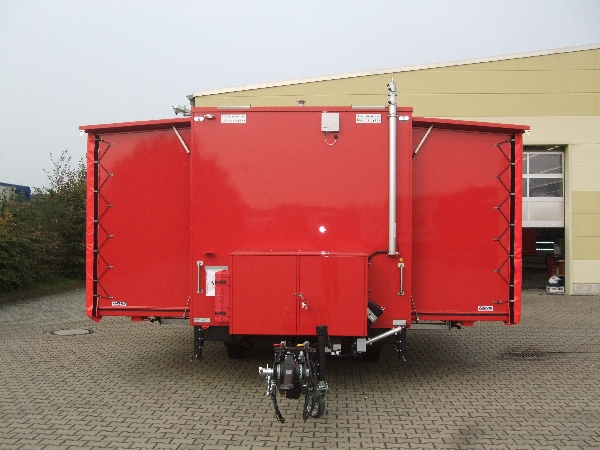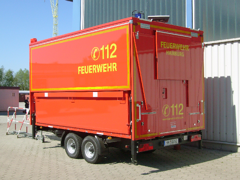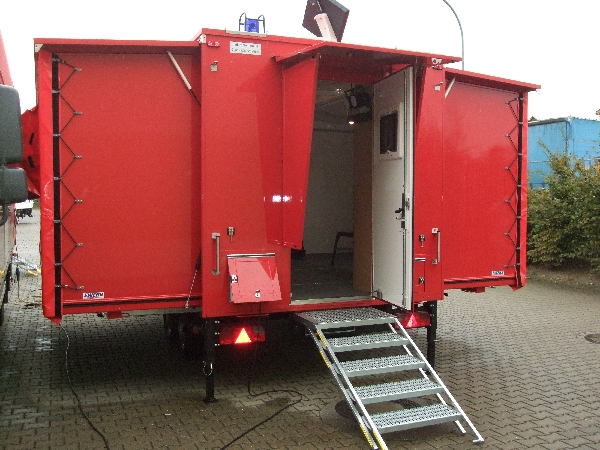 | Der Fw-Anhänger Führung und Lage (FwA-FüLa) wurde als Falt-Container auf einem Tandem-Achsanhänger aufgebaut. Die beiden Seiten des Containers können aufgeklappt werden, so dass ein ca. 20 qm großer mobiler Führungs- und Lageraum zur Verfügung steht. |