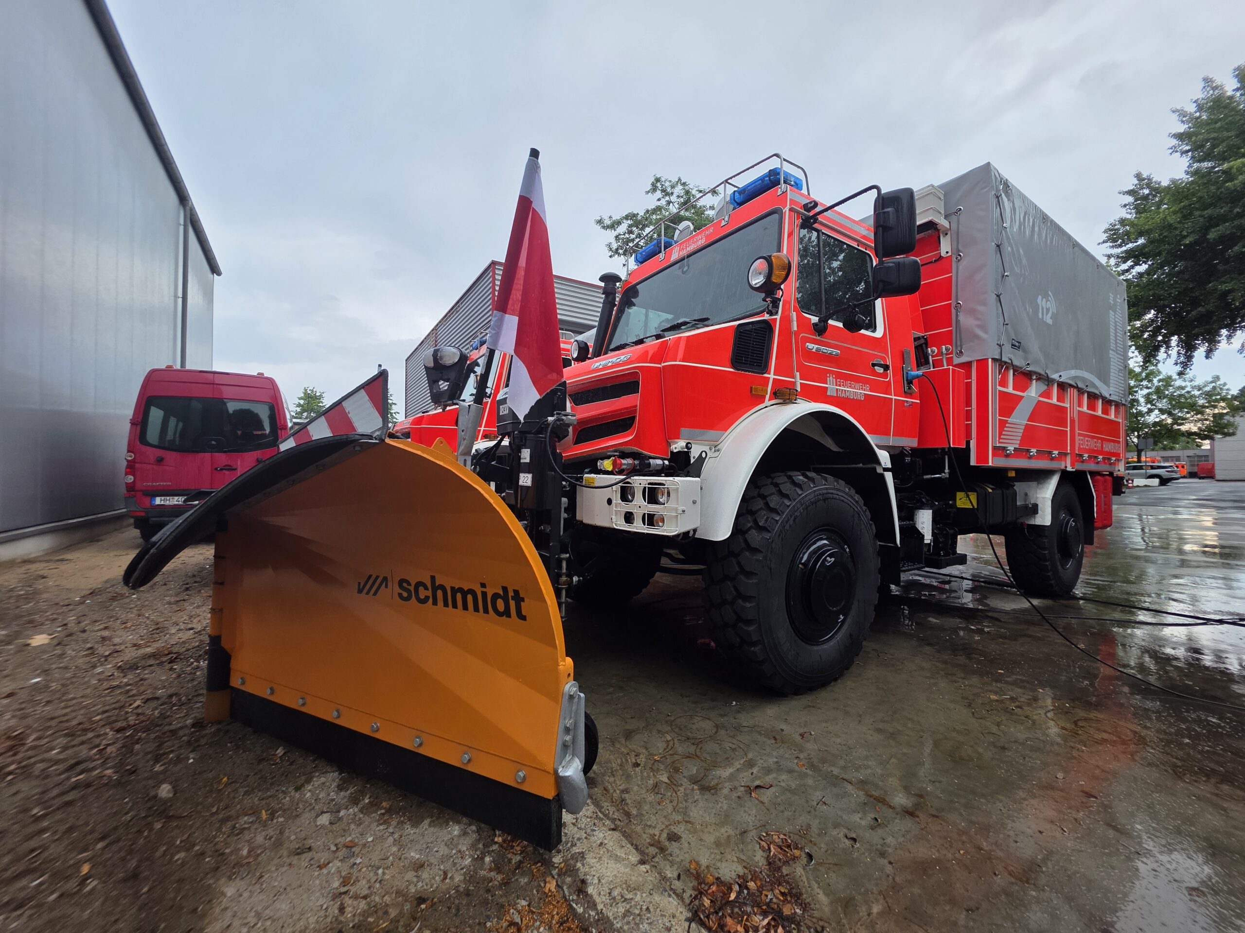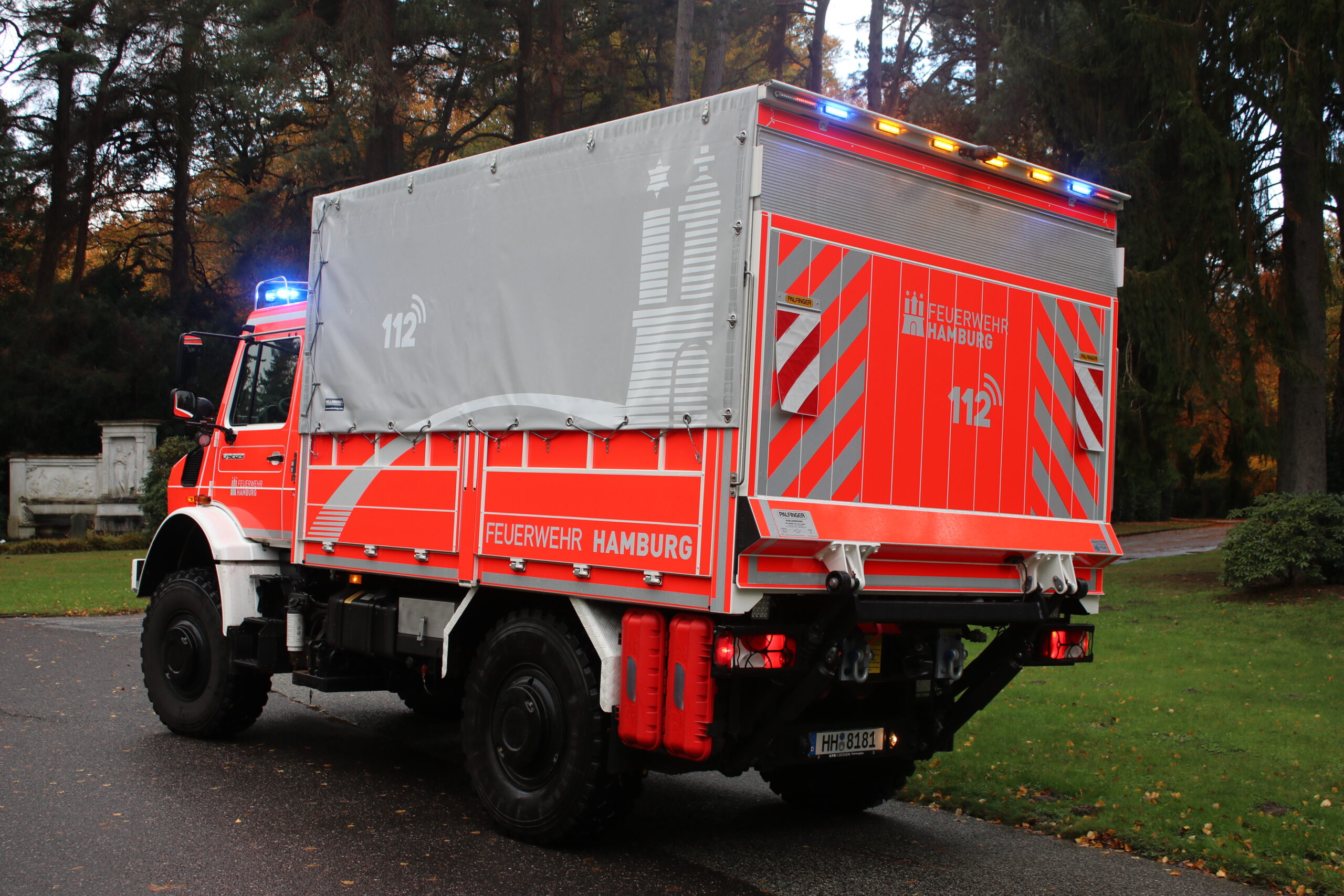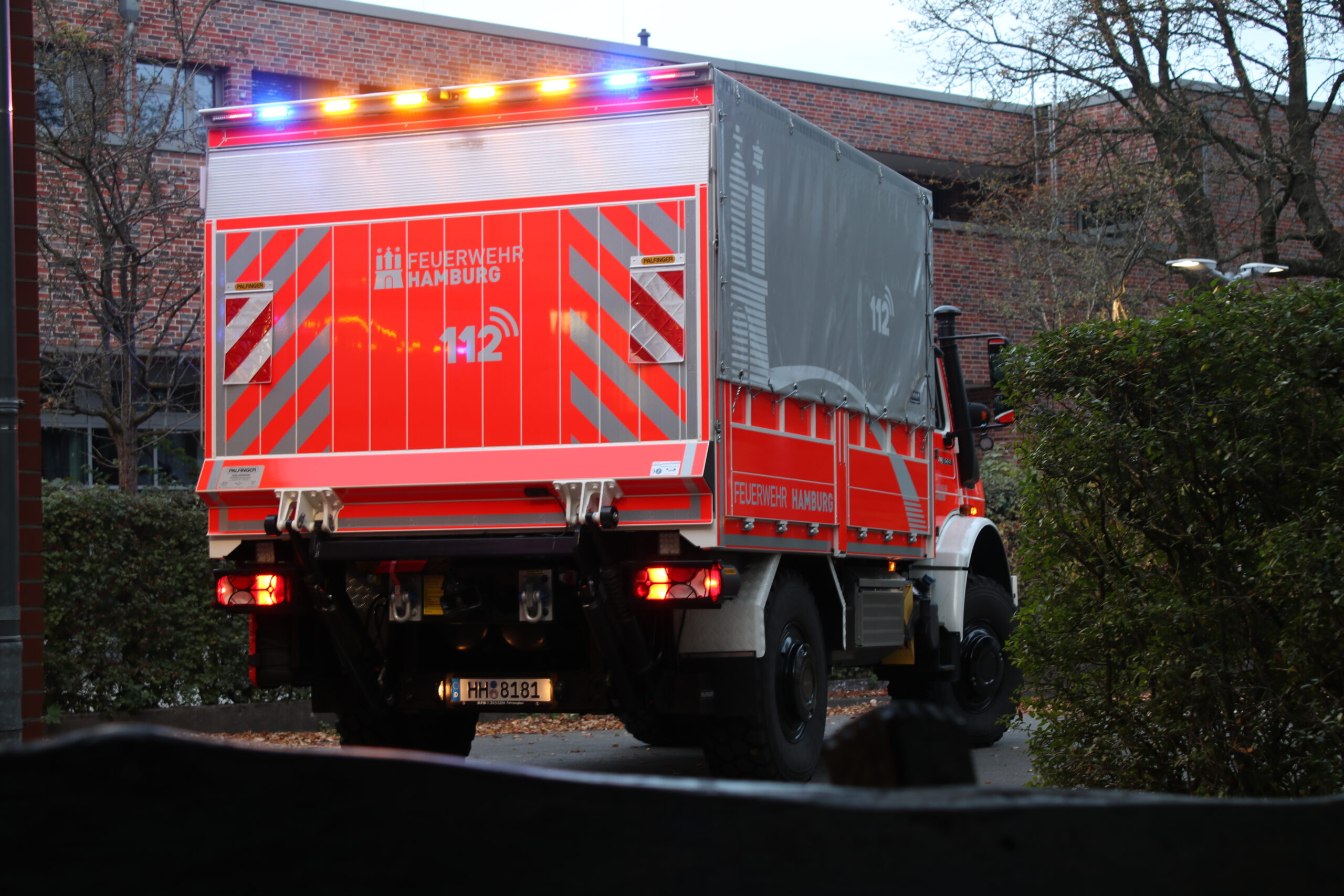 Heckabsicherung mit blauen und gelben LED-Leuchten.