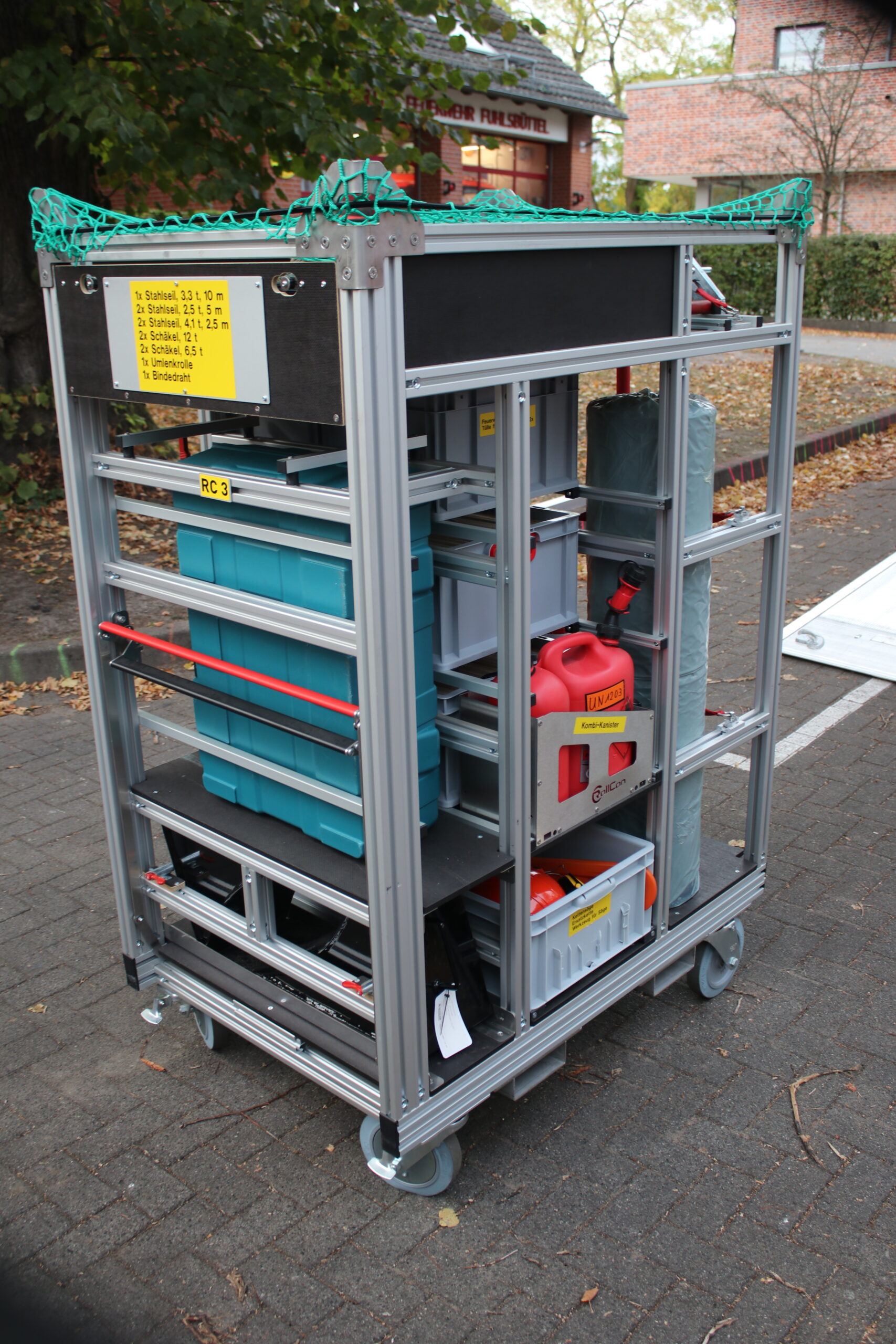 Beladung mit 3 rollbaren Gitterboxen mit Material für die technische Hilfeleistung wie z.B. Pump- und Lenzarbeiten sowie Beleuchtungssaufgaben.