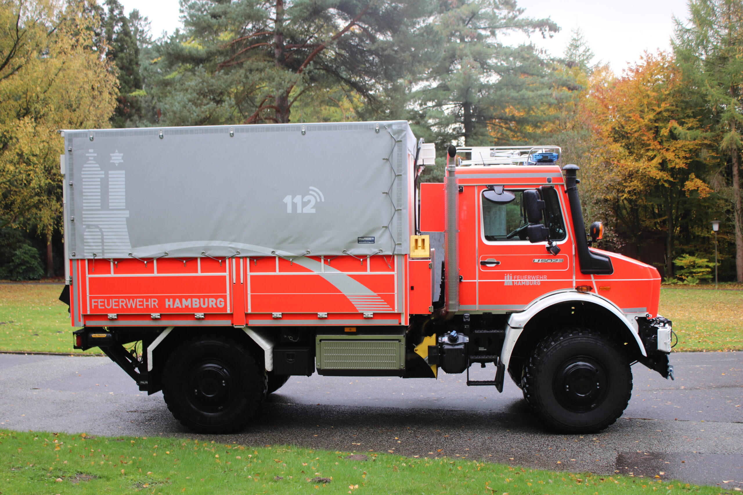 Plane in Grau, Truppkabine 1/2, Seilwinde Rotzler 50 KN, Warnanlage Hänsch DBS 850 mit Martin-Kompressorhornanlage und LED-Frontblitzleuchten. Ausserdem Bullhorn auf dem Dach.