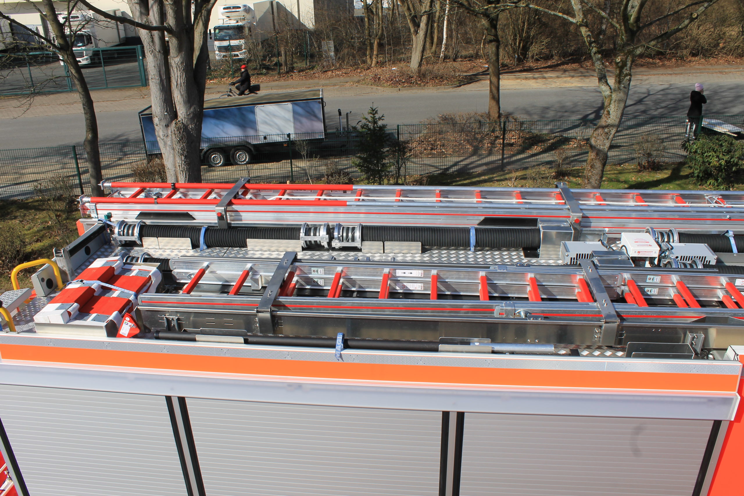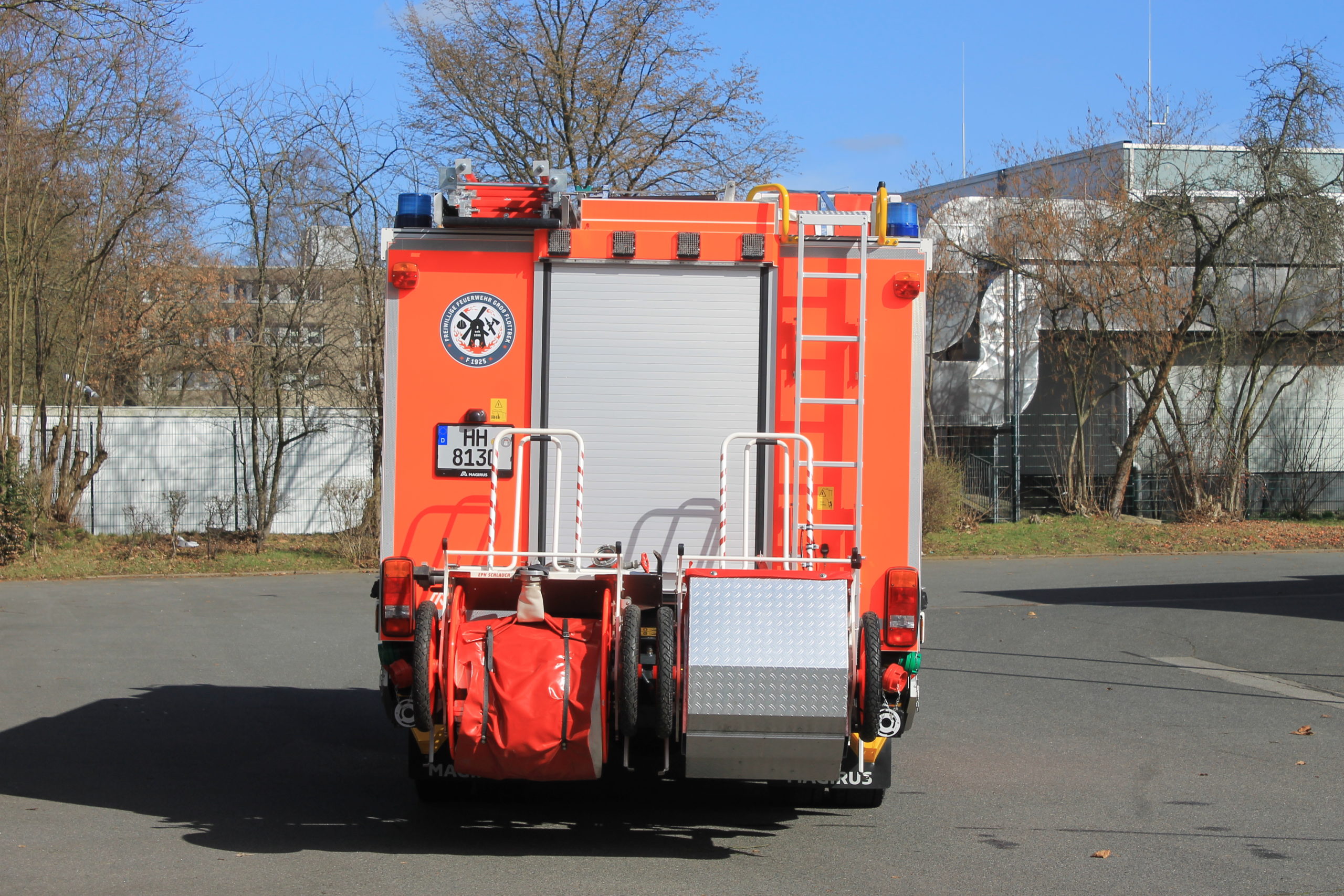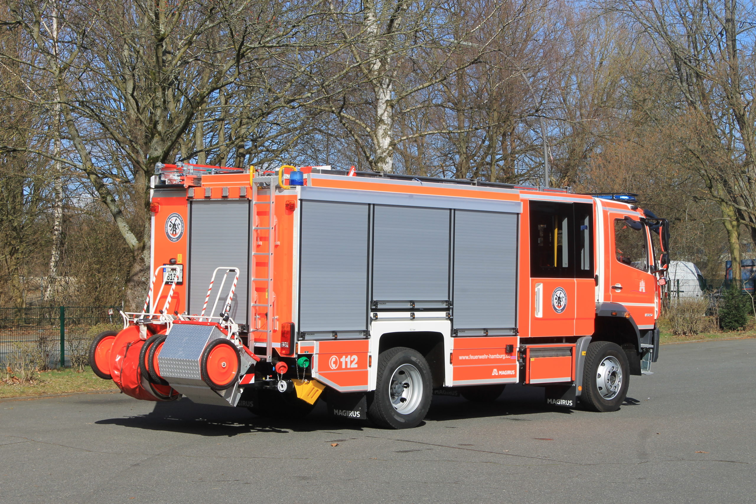 2x Einmann-Schlauchhaspeln: 1x 160 m B-Schlauch (8 Schläuche je 20m) und 1x Verkehrssicherungsgerät, am Fahrzeugheck