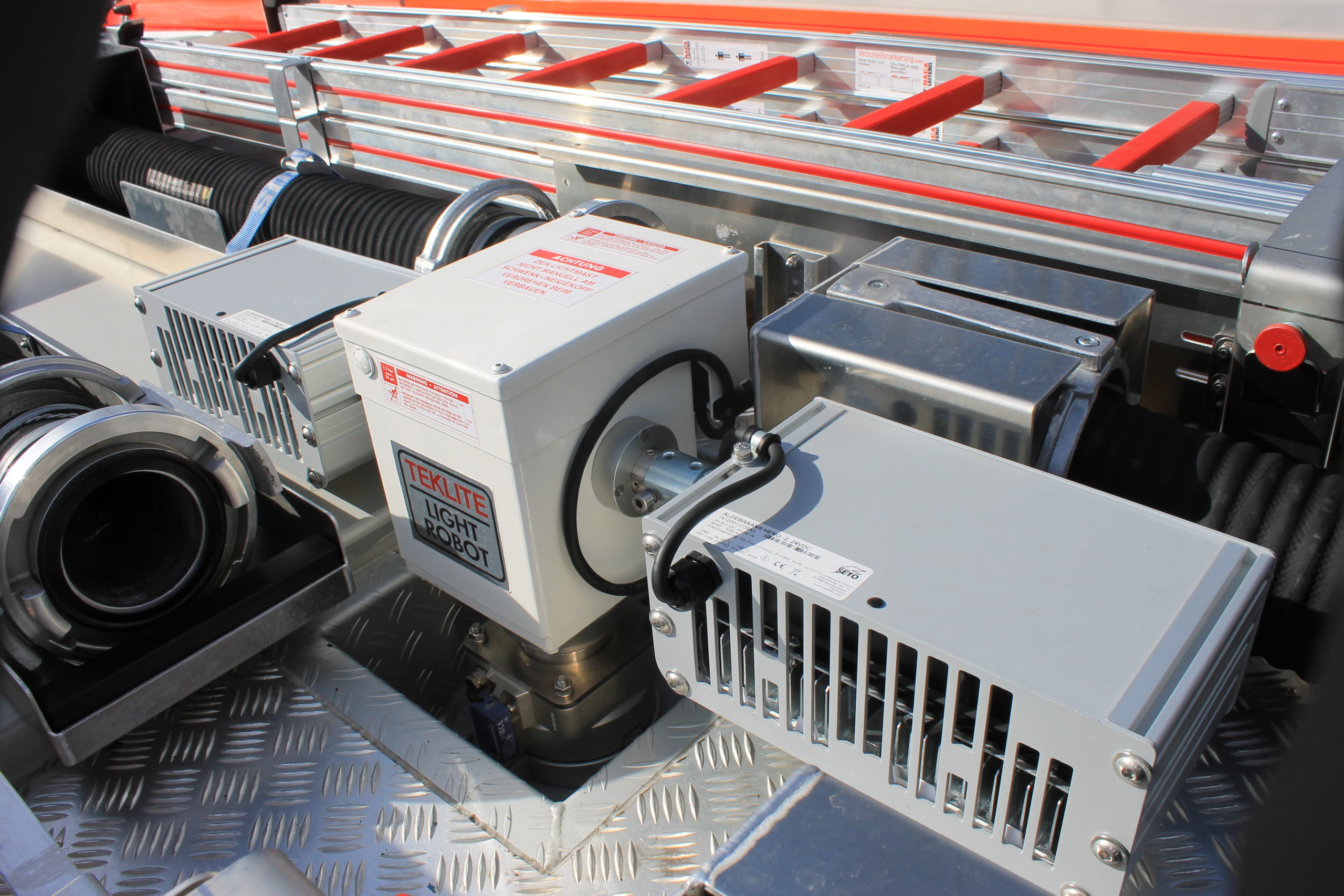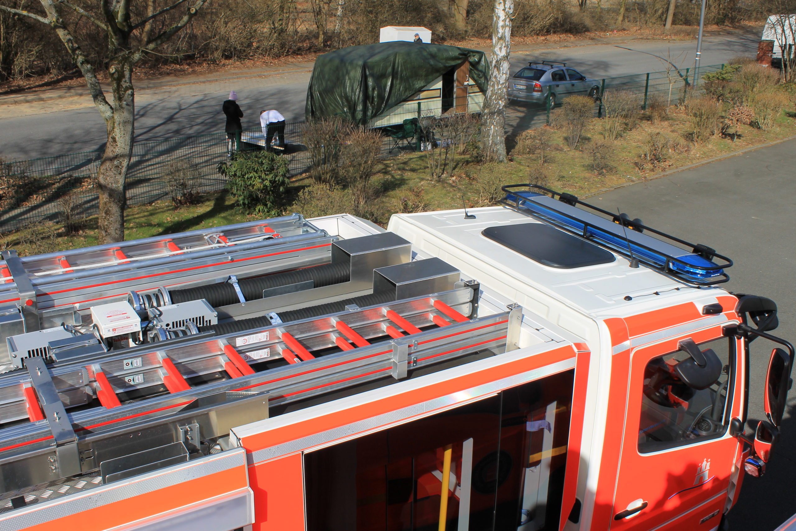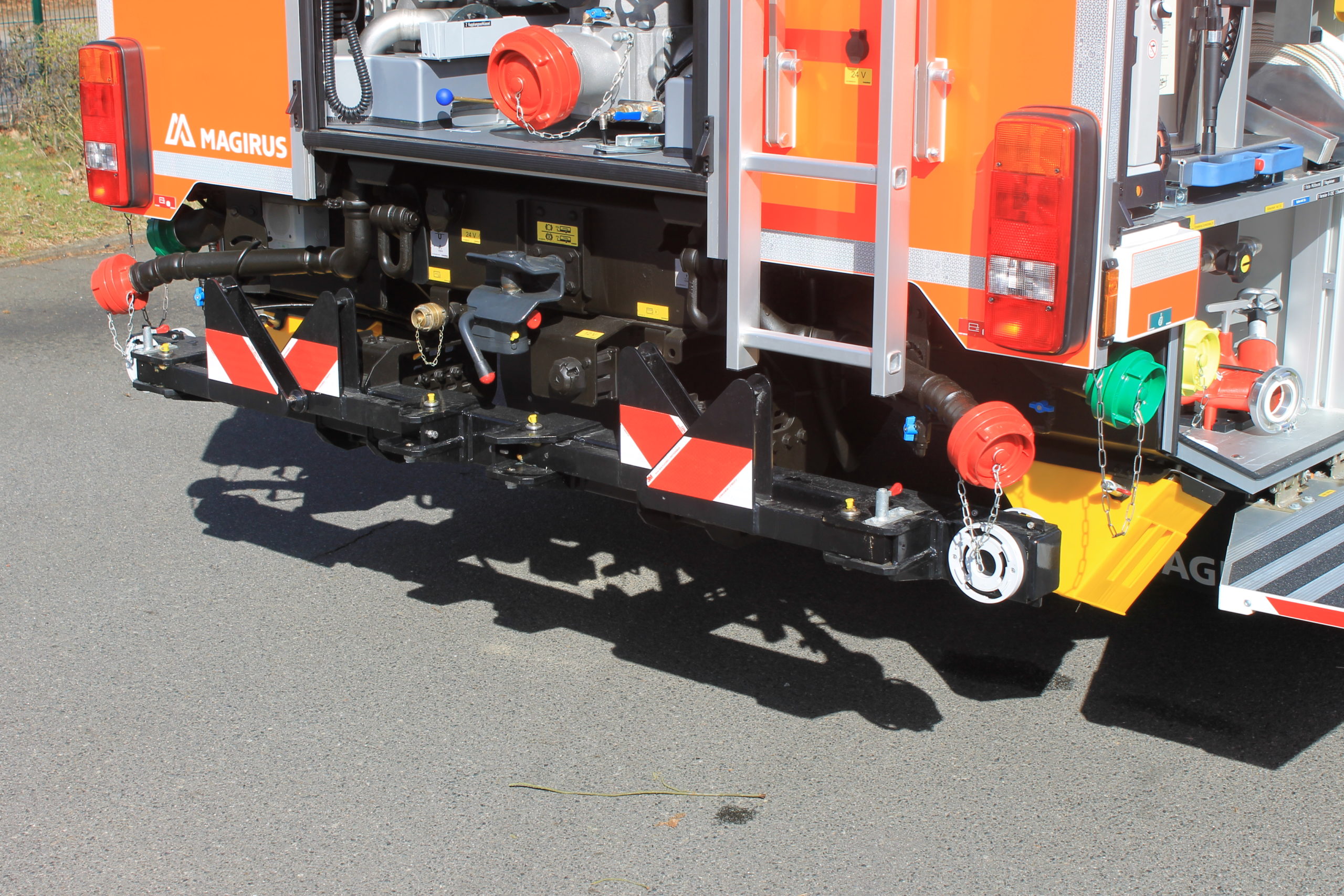 Bei der Sondersignalanlage wurde auf LED gesetzt. Auf der Kabine verfügt das HLF über einen Dachbalken Hänsch DBS 5000 mit Zusatz- und Powerblitzern. Die Pressluftfanfaren befinden sich nunmehr unter der Stoßstange, um bei Alarmfahrt den Lärm für die Mannschaft zu verringern. Zwei Druckkammerlautsprecher sowie zwei LED-Scheinwerfer sind weiterhin auf dem Dach der Kabine angeordnet. Im Kühlergrill sind nun vier blaue Hänsch Sputnik-LED-Frontlitzer zu finden. Die Heckabsicherung kann neben zwei weiteren LED Blaulichtern Hänsch Comet durch ein gelbes LED-Heckwarnsystem der Firma Magirus sichergestellt werden. Auch der Lichtmast und die Flutlichttrage sind in LED ausgeführt.