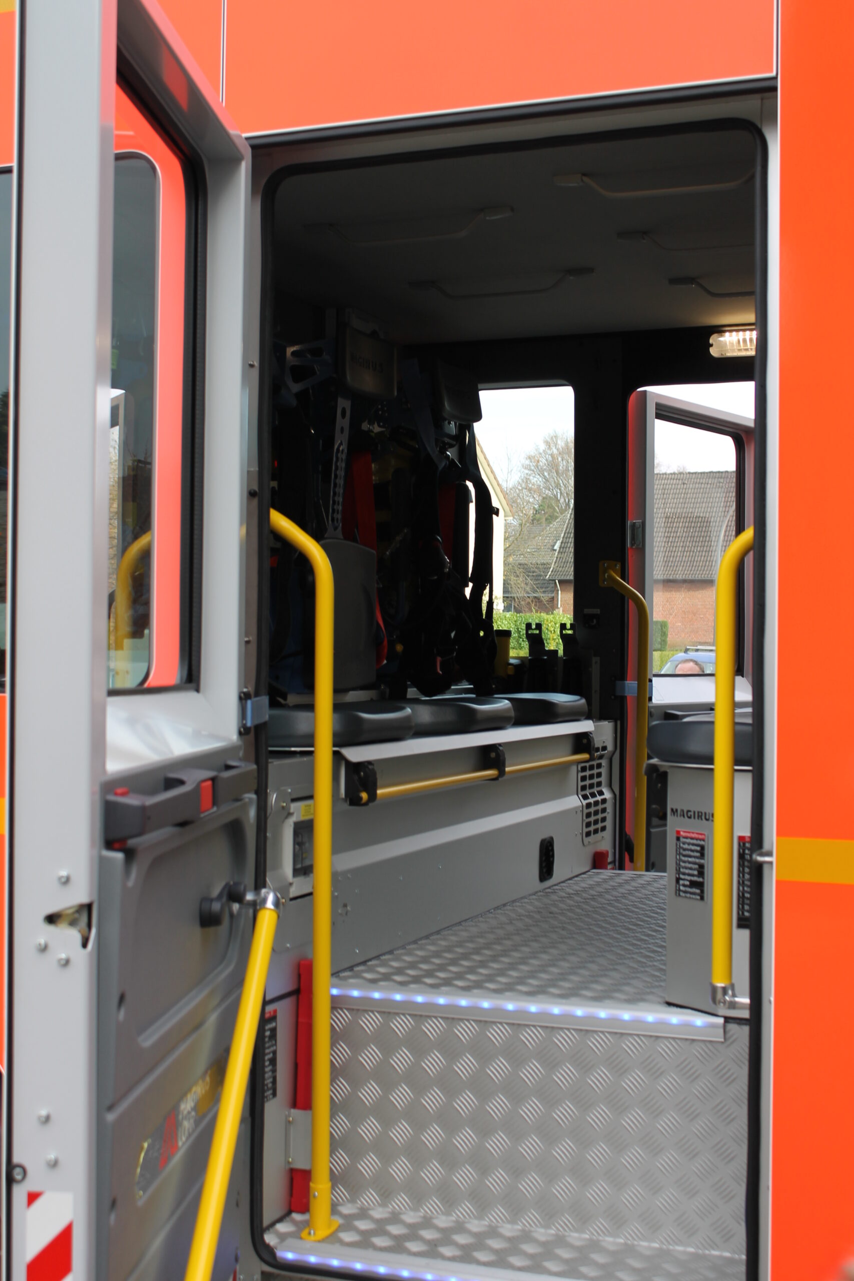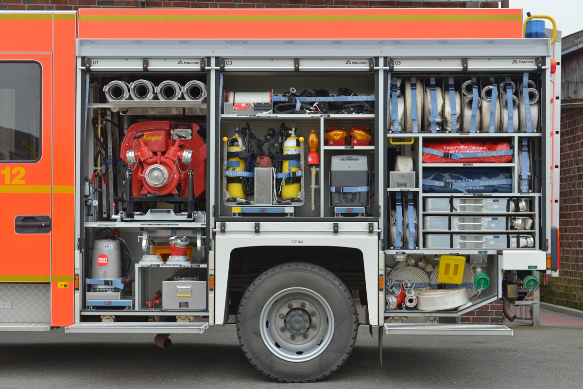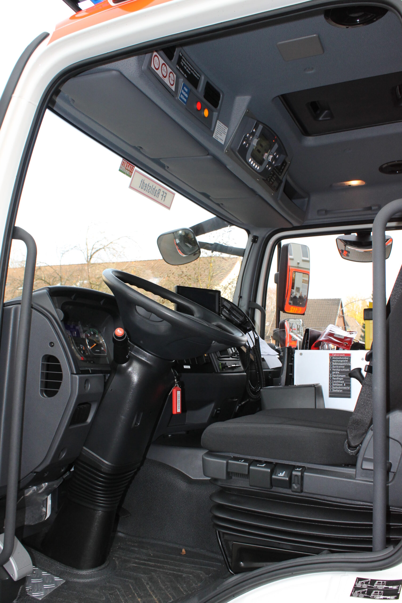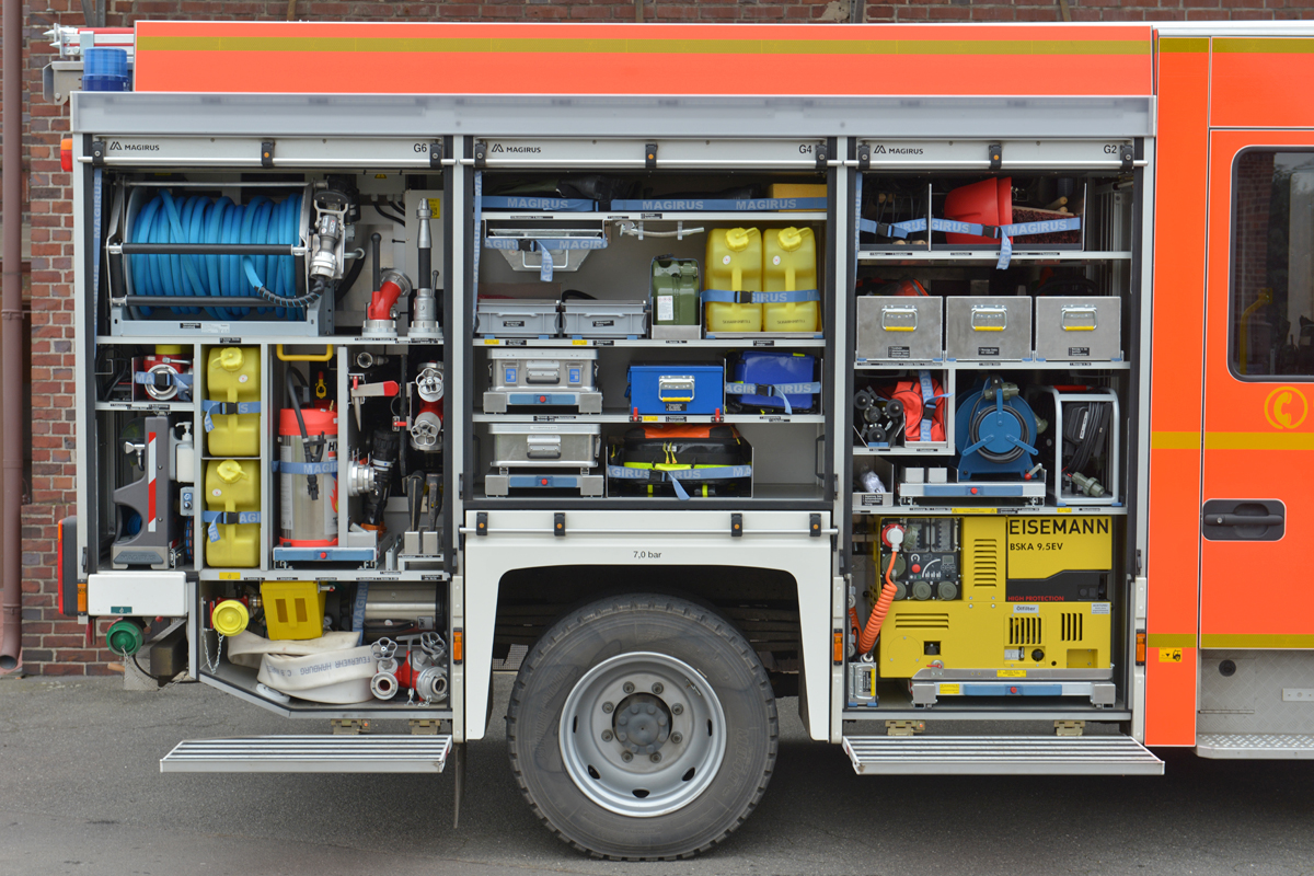 Automatikgetriebe, Magirus-HMI-Verbindung (Human-Machine-Interface), Navigationsgerät mit eingearbeitetem Hydrantenplan, automatische Trennung der Ladeverbindung beim Starten (RettBox), Mannschaftsraumbeleuchtung in weiß oder rot schaltbar.