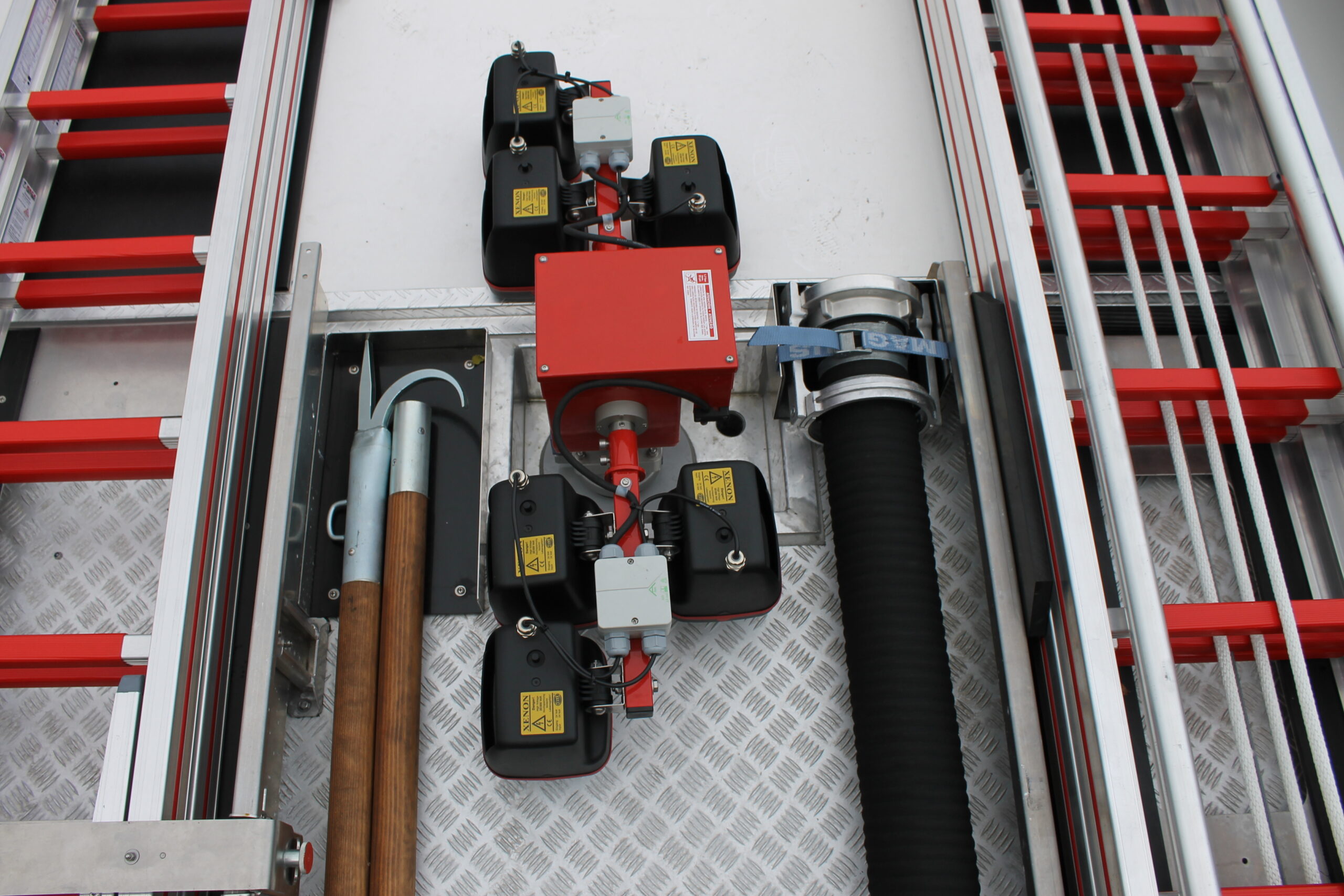 30B-Längen, davon 18 in 6x 3 B-Schlauchkästen über der Pumpe, die während der Fahrt verlegt werden können,