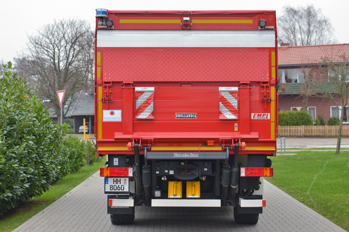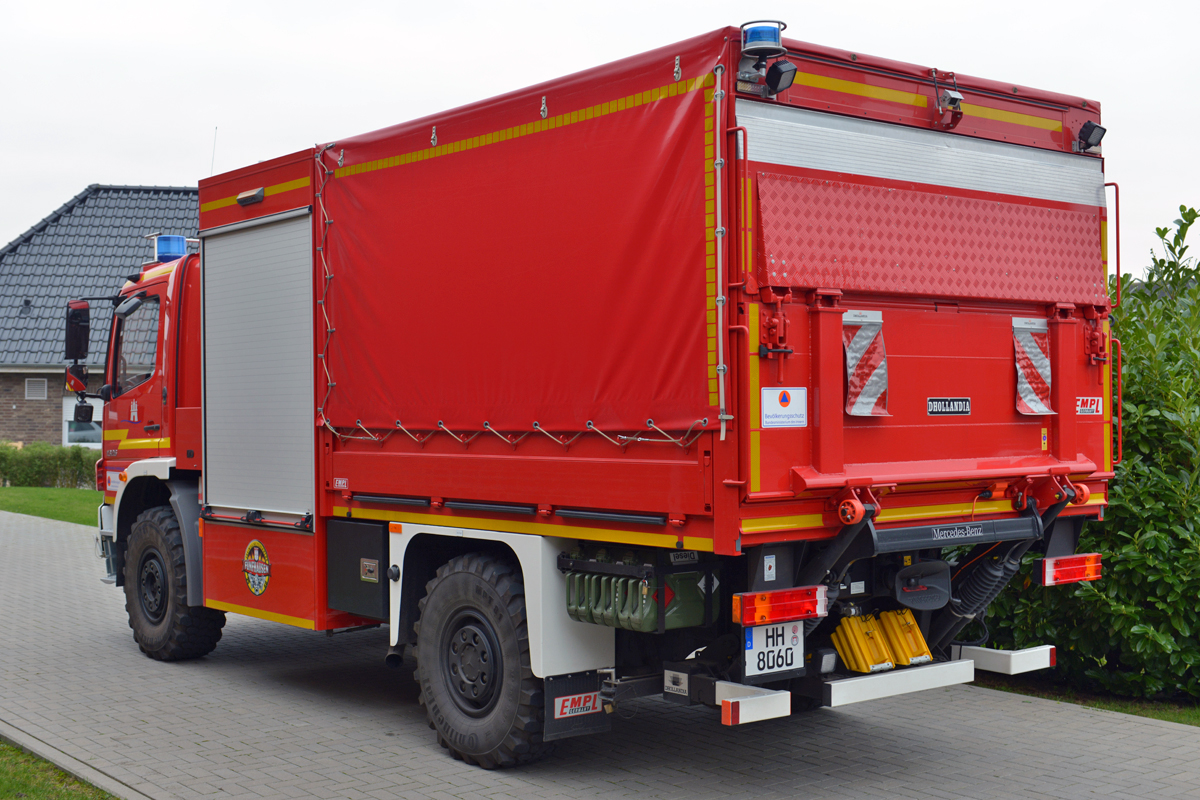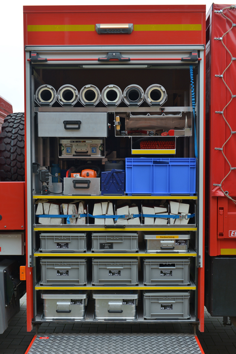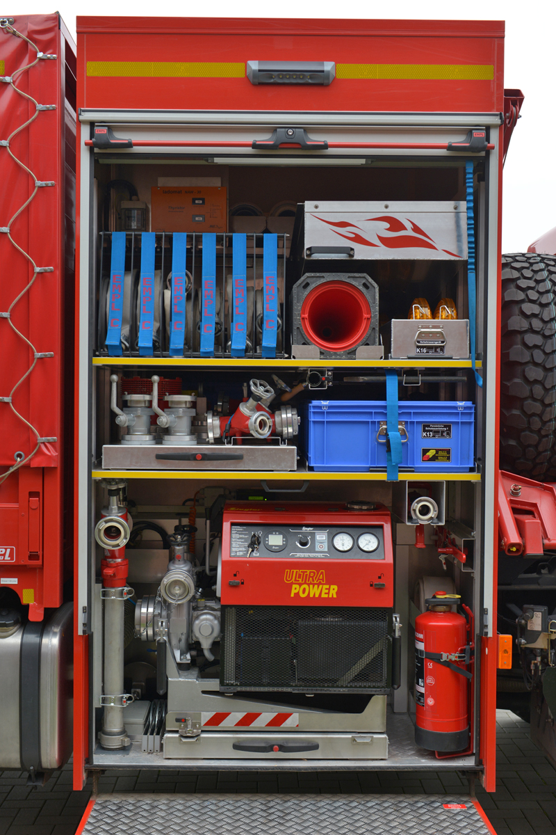 Durch weitere Schläuche und Armaturen ist auch ein autarker Einsatz des Fahrzeuges bei kleineren Bränden möglich. Durch die Ladebordwand besteht