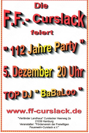 Am 5. Dezember 2015 ab 20 Uhr laden wir zur 112 Jahre Party im Zentrum von Curslack Vierländer Landhaus, Curslacker Heerweg 2a.