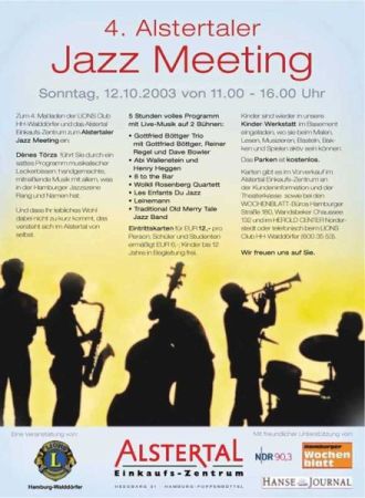 Am kommenden Sonntag, 12. Oktober 2003, findet das vierte Alstertaler Jazz Meeting von 11 bis 16 Uhr im AEZ statt.