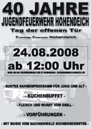 Gegründet 1968, feiert die Jugendfeuerwehr Hohendeich zusammen mit der FF Hohendeich ihr 40-jähriges Bestehen. Feiern Sie mit uns. Am SONNTAG 24.08.08 ab 12:00 Uhr. Natürlich rund um das Feuerwehrhaus der FF Hohendeich – Ochsenwerder Elbdeich 325.