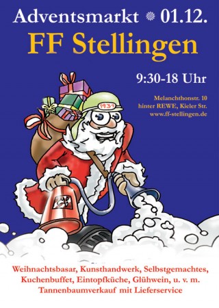 Am Samstag, den 01.12.2007 findet ab 10 Uhr der alljährliche Adventsmarkt der FF Stellingen statt. Frisch gestärkt durch einen warmen Eintopf können sie den Rundgang durch die Räumlichkeiten der FF Stellingen starten und die vielen Stände mit ihren Angeboten bestaunen oder auch etwas kaufen: Angeboten werden wie immer Weihnachtsbasteleien, Tiffany-Artikel, Obst und vieles mehr.