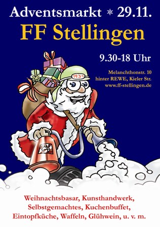 Am Samstag, den 29.11.2008 findet ab 10 Uhr der alljährliche Adventsmarkt der FF Stellingen statt. Frisch gestärkt durch einen warmen Eintopf können sie den Rundgang durch die Räumlichkeiten der FF Stellingen starten und die vielen Stände mit ihren Angeboten bestaunen oder auch etwas kaufen: Angeboten werden wie immer Weihnachtsbasteleien, Tiffany-Artikel, Obst und vieles mehr.