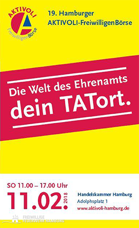 Am 11.02.2018 ist die Freiwillige Feuerwehr Hamburg zum 5.Mal auf der AKTIVOLI Freiwilligenbörse in der Handelskammer vertreten. Hier haben alle Bürgerinnen und Bürger die einmalige Gelegenheit, sich über das bürgerschaftlichen Engagement in Hamburg zu informieren. Natürlich sind auch wir von der Freiwilligen Feuerwehr Hamburg wieder mit dabei und stehen Rede und Antwort!