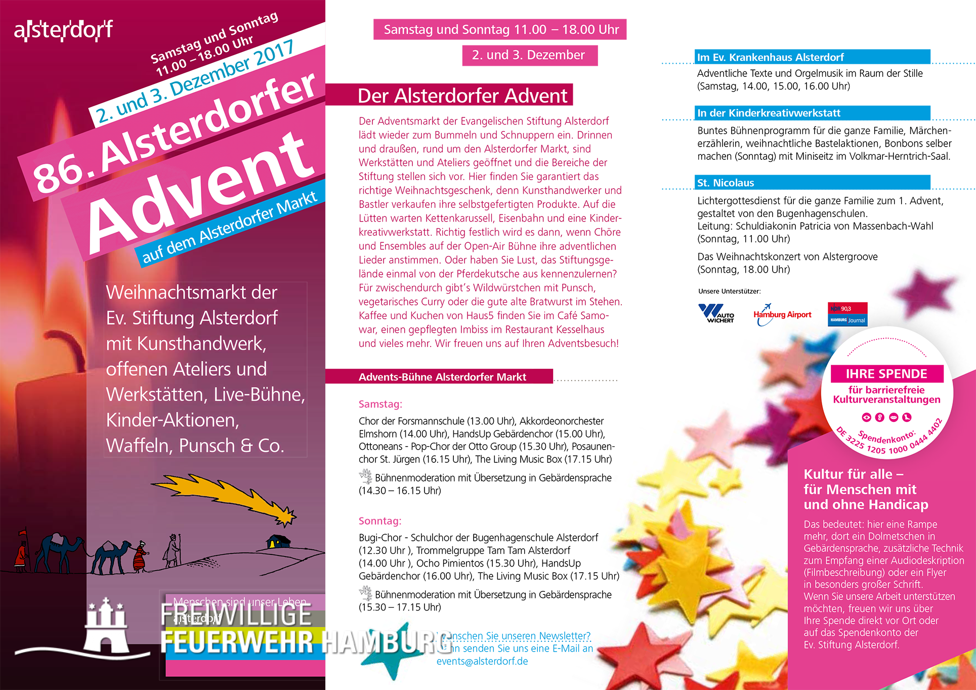 Alle Jahre wieder kommt auch der Alsterdorfer Adventmarkt, der über die Stadtgrenzen hinaus bekannt ist. Der Weihnachtsmarkt findet rund um den Alsterdorfer Markt auf dem Gelände der Evangelischen Stiftung Alsterdorf statt. Auch wir, die FF Alsterdorf sind wieder mit dabei. Fern ab vom großen Weihnachtsrummel geht es auf dem Alsterdorfer Advent von je her gelassen und beschaulich zu.
