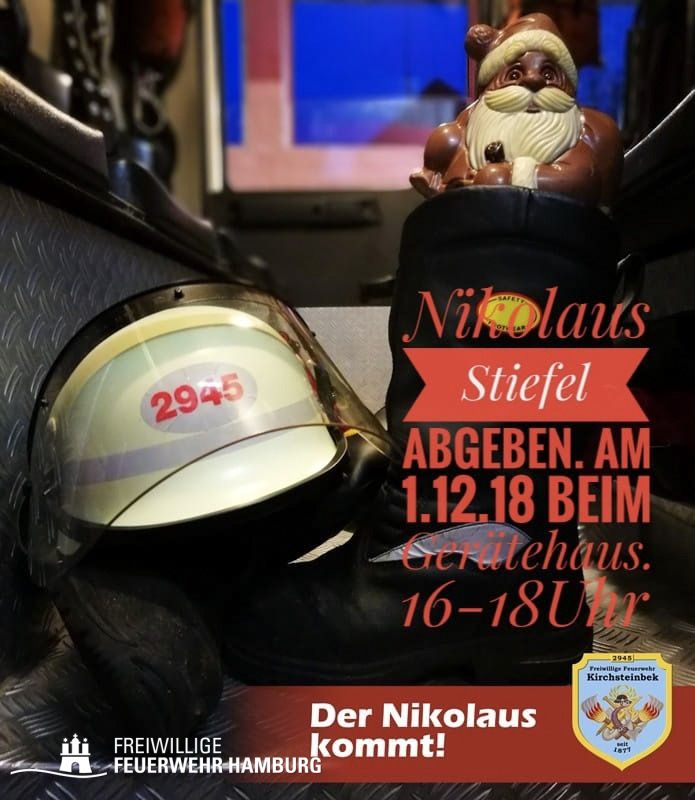 Der Nikolaus kommt auch dieses Jahr wieder in die Wache der Frewilligen Feuerwehr Kirchsteinbek. Und jedes Kind das uns einen geputzten Stiefel am 01.12.2018 zwischen 16 und 18 Uhr vorbei bringt, kann sich den hoffentlich reichlich gefüllten Stiefel am 09.12.2018 ab 16 Uhr wieder abholen.