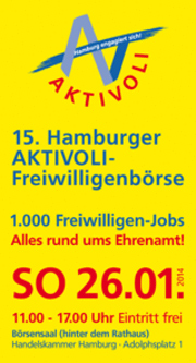 Die Freiwillige Feuerwehr Hamburg ist dieses Jahr erstmalig, am 26. Januar, auf der AKTIVOLI-Freiwilligenbörse, in der Handelskammer Hamburg vertreten. Hier haben Bürger eine einmalige Möglichkeit sich über die Vielfalt des bürgerschaftlichen Engagements in Hamburg zu informieren. Die AKTIVOLI-Freiwilligenbörse hat das Ziel interessierte Menschen und gemeinnützige Projekte aus den Bereichen Soziales, Kultur oder Umweltschutz zusammen zu bringen.