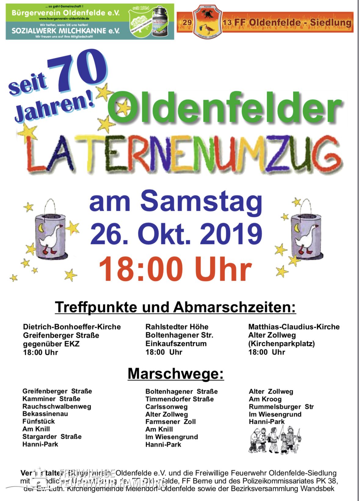 Am Samstag, den 26. Oktober ist es wieder soweit. Unterstützt von den Freiwilligen Feuerwehren Berne und Oldenfelde, starten wieder drei Umzüge um Sie durch das abendliche Oldenfelde zum Hanni Park zu begleiten.Kommen Sie vorbei und starten Sie um 18:00 Uhr an einem der drei folgenden Treffpunkte: