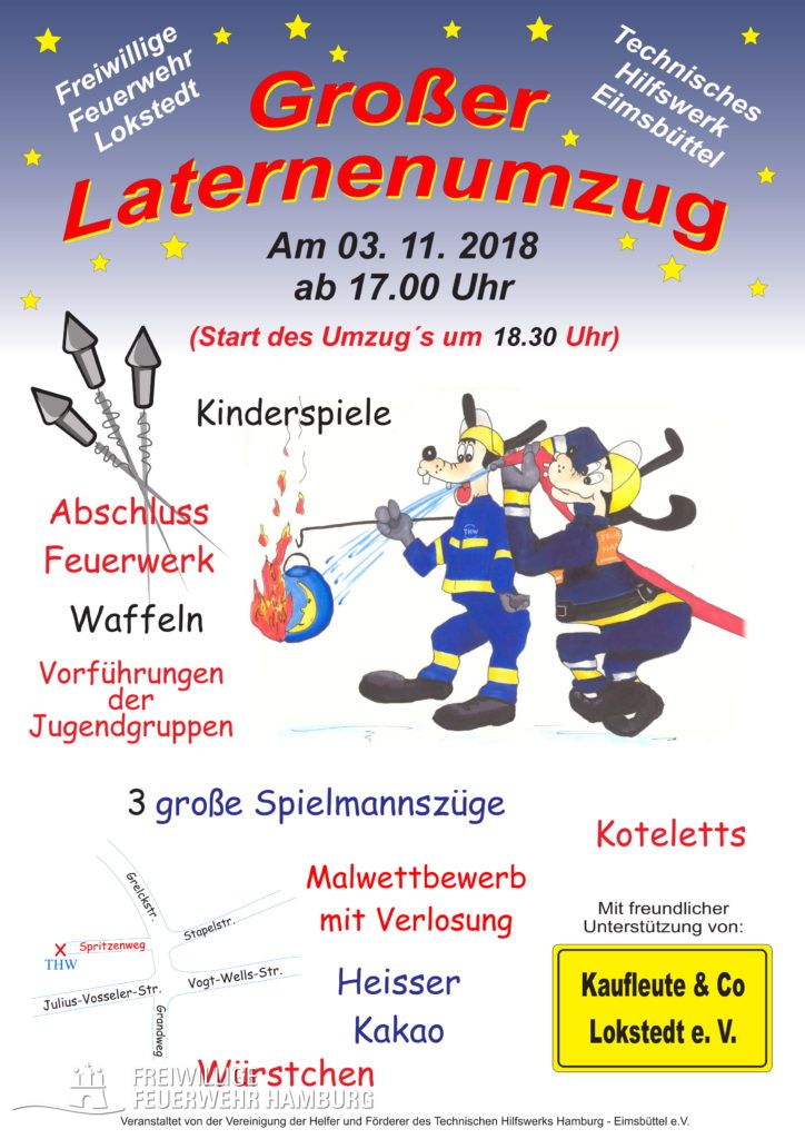 Am Samstag, den 3. November 2018 findet zum 21. Mal in Folge der Laternenumzug mit der Freiwilligen Feuerwehr Lokstedt und dem THW Eimsbüttel statt.
