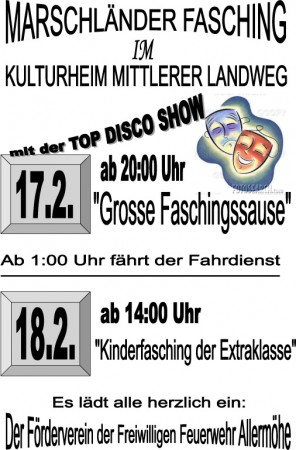 Am Wochenende 17. und 18.02.2007 veranstaltet der Förderverein der FF Allermöhe ein buntes Faschingsfest für groß und klein.
