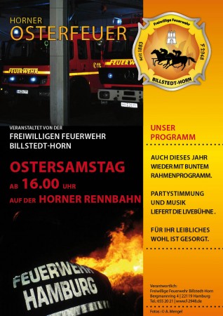 In diesem Jahr veanstaltet die Freiw. Feuerwehr Billstedt-Horn wieder ihr traditionelles Osterfeuer auf dem Freizeitgelände der Horner Rennbahn.