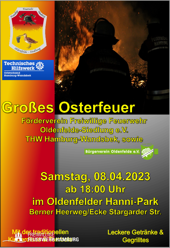 Am Ostersamstag des 08. April 2023 möchten wir, der Förderverein der Freiwilligen Feuerwehr Oldenfelde-Siedlung e.V. zusammen mit dem THW Hamburg-Wandsbek und dem Bürgerverein Oldenfelde, Sie wieder herzlich zu unserem traditionellen Osterfeuer im Hanni Park einladen.