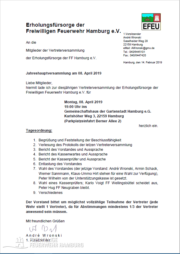 hiermit lade ich zur diesjährigen Vertreterversammlung der Erholungsfürsorge der Freiwilligen Feuerwehr Hamburg e.V. für