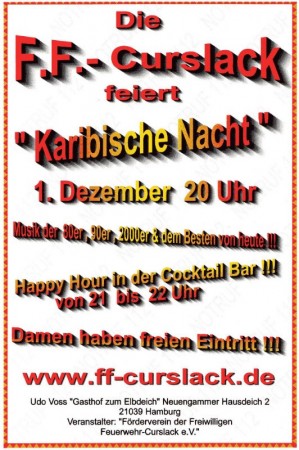 Im letzten Jahr feierten wir in Spanien, in diesem Jahr wird es karibisch werden. Am 1. Dezember 2007 ab 20 Uhr feiert die FF Curslack eine karibische Nacht (früher Feuerwehrball). Der Festsaal wird in karibisches Flair gehüllt, lasst euch einfach überraschen was euch dort erwarten wird. Von 21 – 22 Uhr haben wir die Happy Hour in der Cocktailbar mit leckeren Cocktails, frühes Erscheinen lohnt sich also. Der DJ legt die besten Hits der 80er, 90er 2000er und dem Besten von heute auf. Aber auch Hits aus den 60er sind mit Sicherheit dabei. Für Musikwünsche sind wir ganz offen. Die Veranstaltung findet im Gasthof zum Elbdeich am Neuengammer Hausdeich 2 direkt an der Elbe im Stadteil Neuengamme statt. Schicke Kleidung ist durchaus angebracht. Also kommt einfach zu unserer karibischen Nacht und tragt euch den Termin schon einmal ein! Es wir eine lange Nacht! Eintritt für Damen frei!!! Veranstalter: Förderverein der Feiwilligen Feuerwehr Curslack e.V.