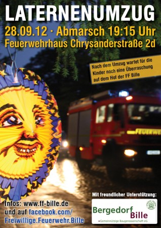Am Freitag, den 28.09.2012 findet unser Laternenumzug statt. Abmarsch ist um 19:15 Uhr am Feuerwehrhaus in der Chrysanderstraße 2d. Wir laden daher alle Eltern, deren Kinder, Großeltern und Freunde herzlich ein uns zu begleiten. Der Umzug wird von 2 Spielmannszügen und den Kameradinnen und Kameraden der Freiwilligen Feuerwehr Bille angeführt und gesichert.