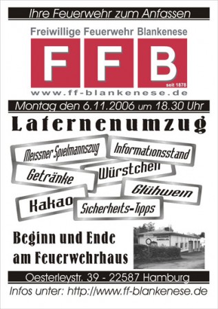 Am Montag, den 6. November 2006, veranstaltet die Freiwillige Feuerwehr Blankenese traditionsgemäß einen Laternenumzug. Treffpunkt ist um 18:30 Uhr am Feuerwehrhaus der FF Blankenese in der Oesterleystraße 39. Dort wird der Umzug um 18.45 Uhr starten und nach ca. 45 Minuten auch wieder enden. Musikalisch wird der Umzug von dem „Meissner-Spielmannszug der Stadt Schenefeld“ begleitet.
