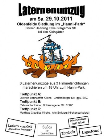 Ab 18.00 Uhr stehen an allen Startpunkten Spielmannszüge sowie die FF-Berne und FF- Oldenfelde bereit, um mit unseren “Kleinen” wie auch’Großen‘ Mitbürgern durch das abendliche Oldenfelde zum Festplatz ( Stargarder Str. / Hannipark) zu gelangen.