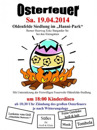 Das diesjährige Osterfeuer im Hanni-Park (Stargarder Str. / Ecke Berner Heerweg) findet am Ostersamstag, den 19.04.2014 ab 17.30 Uhr statt. Um 18.00 Uhr veranstalten wir im Bereich der Bühne eine Kinderdisco . Im Anschluss wird dann je nach Witterungslage, vermutlich gegen 18.30 Uhr, das große Feuer gezündet.