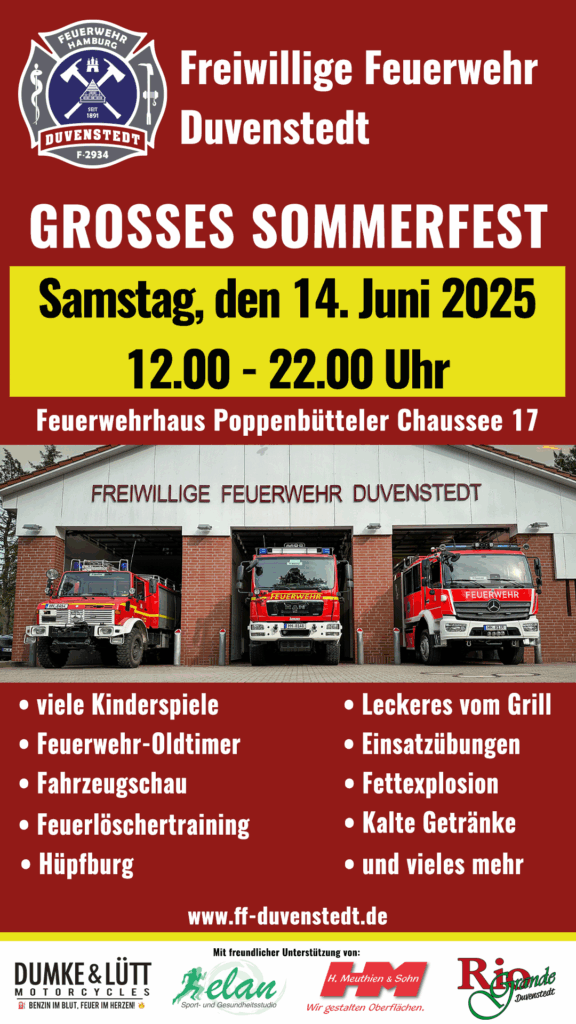Am 14. Juni lädt die Freiwillige Feuerwehr Duvenstedt wieder zum Sommerfest ein. Von 12 bis 22 Uhr erwartet Besucher auf dem Gelände an der Poppenbütteler Chaussee 17 ein abwechslungsreiches Programm. Feuerwehr-Vorführungen wie Fettexplosionen, Erste Hilfe- und technische Hilfeleistungsübungen sowie eine Brandschutzübung der Jugendfeuerwehr bieten spannende Einblicke. Zudem zeigt eine Rettungshundestaffel ihr Können. Für musikalische Unterhaltung sorgt das Orchester Duvenstedt. Kinder können sich auf eine Hüpfburg freuen. Kulinarisch gibt es Spezialitäten vom Grill, frische Pommes, Zuckerwatte und kühle Getränke.