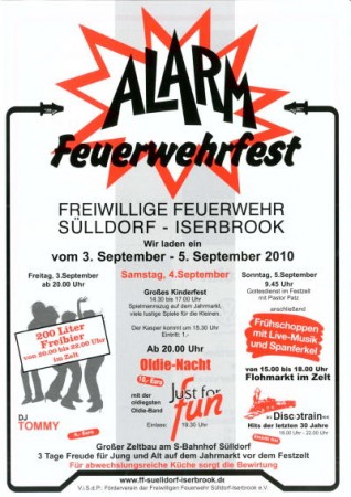 Vom 03. September bis 05. September 2010 lädt die Freiwillige Feuerwehr Sülldorf-Iserbrook zu ihrem alljährlichen Feuerwehrfest auf dem Festplatz beim S-Bahnhof Sülldorf ein.